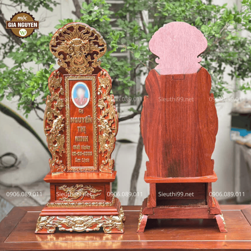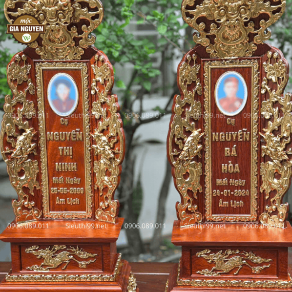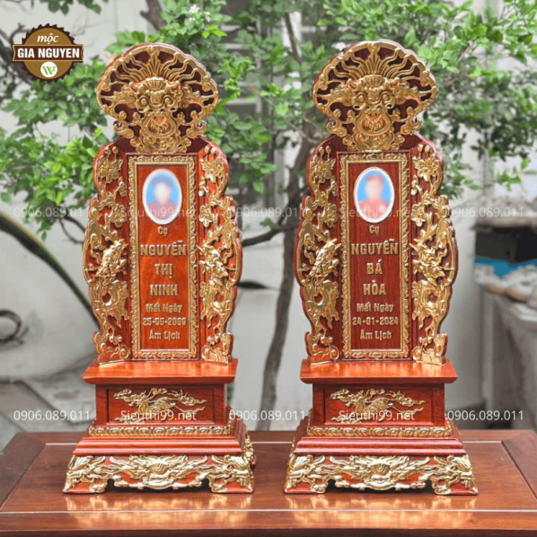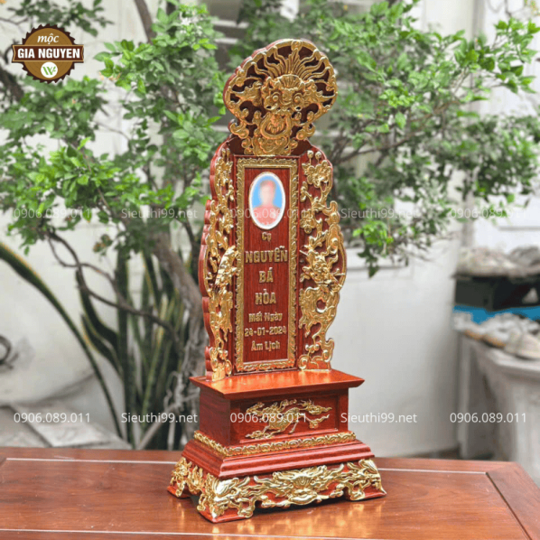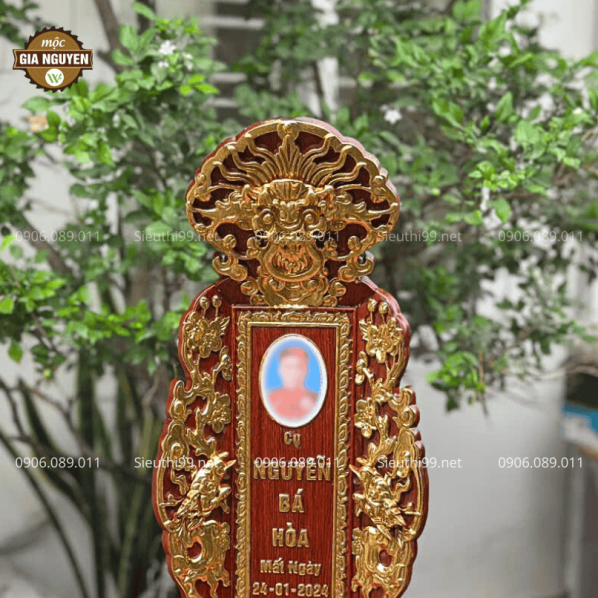 Bài vị gắn ảnh BH09 là sản phẩm thờ cúng cao cấp, kết hợp giữa chất liệu gỗ hương quý giá và nghệ thuật dát vàng tinh xảo. Sản phẩm này không chỉ mang lại vẻ đẹp sang trọng mà còn có ý nghĩa phong thủy sâu sắc.