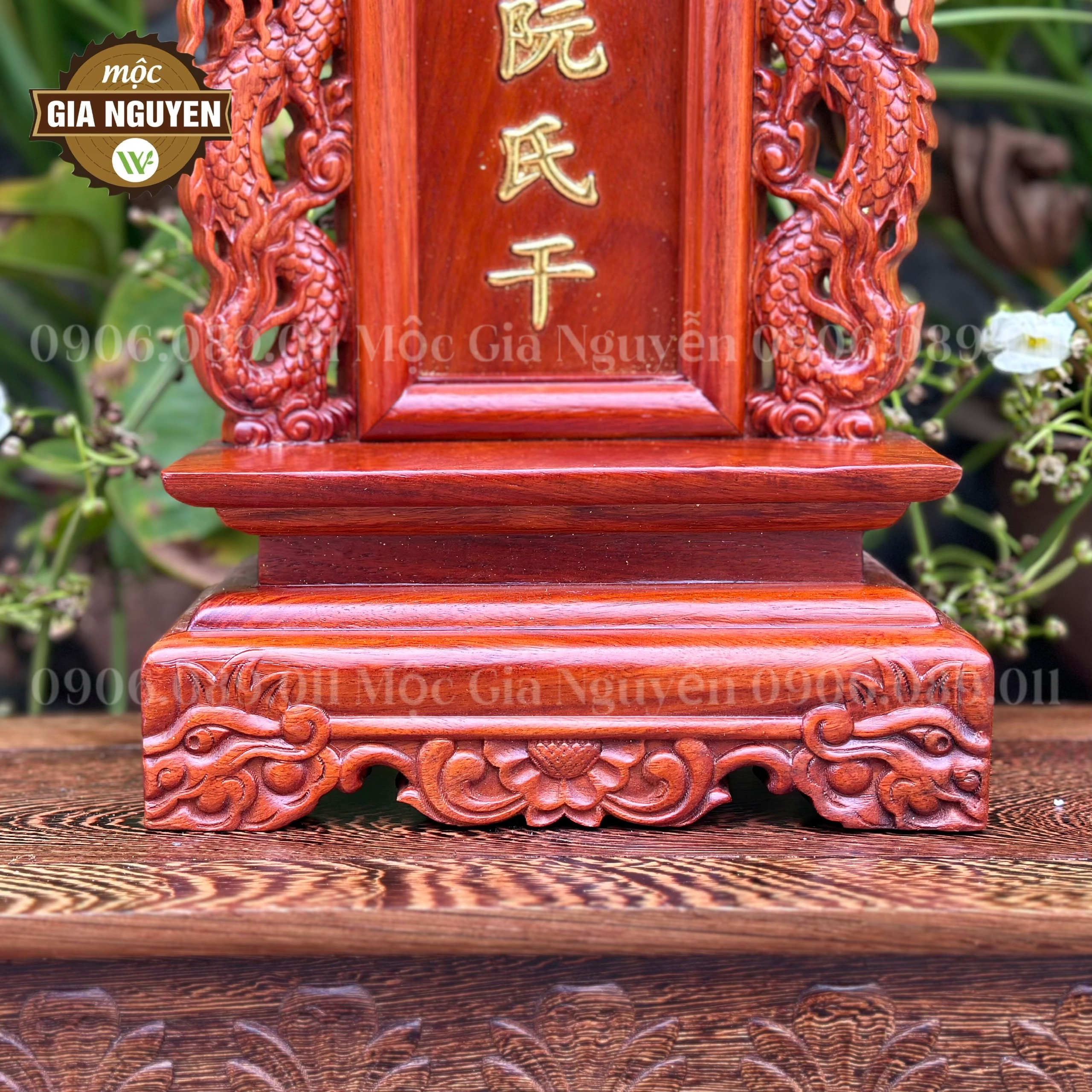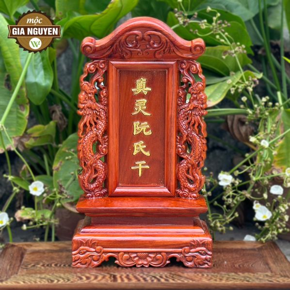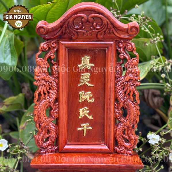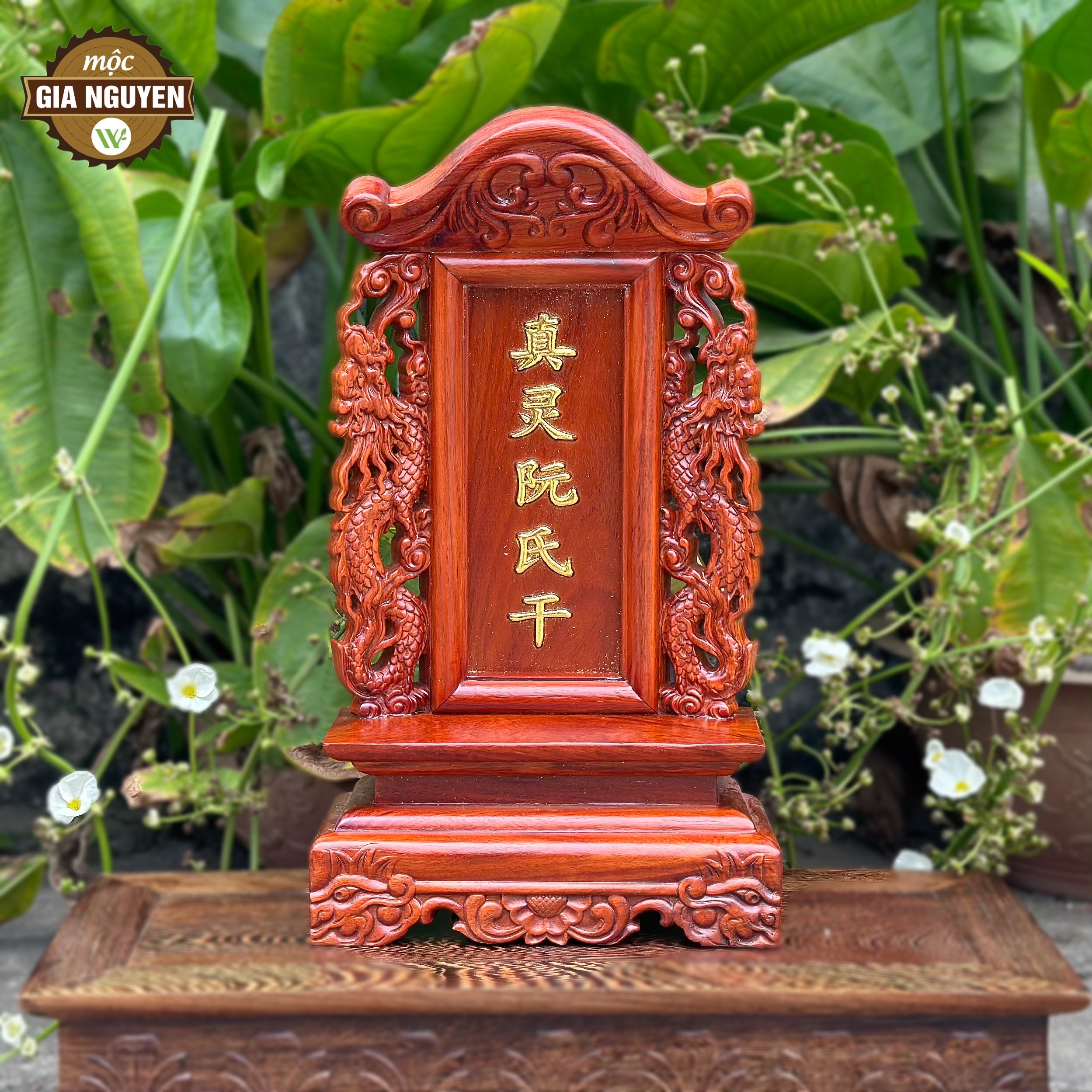 Đây là sản phẩm bài vị thờ song long bằng gỗ hương cao cấp, có chiều cao 43cm, phù hợp để thờ cúng tại gia đình.