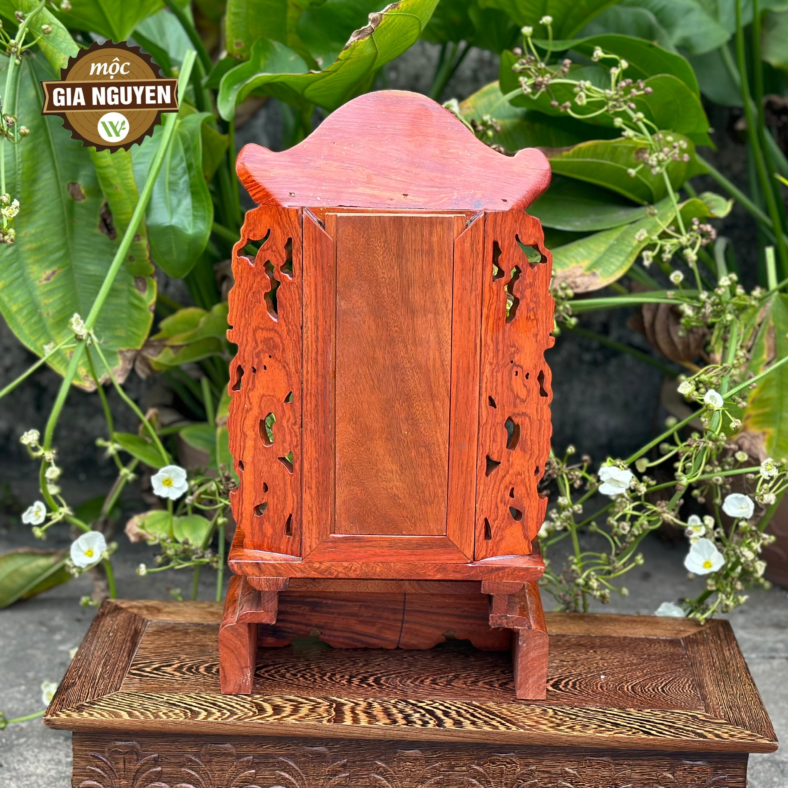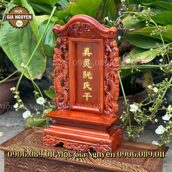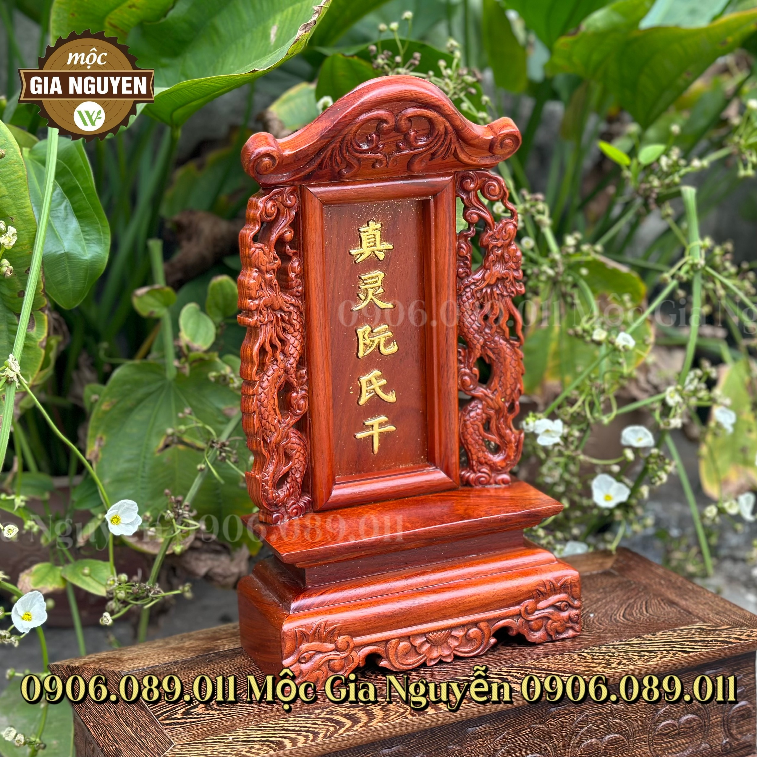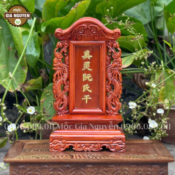Đây là sản phẩm bài vị thờ song long bằng gỗ hương cao cấp, có chiều cao 43cm, phù hợp để thờ cúng tại gia đình.