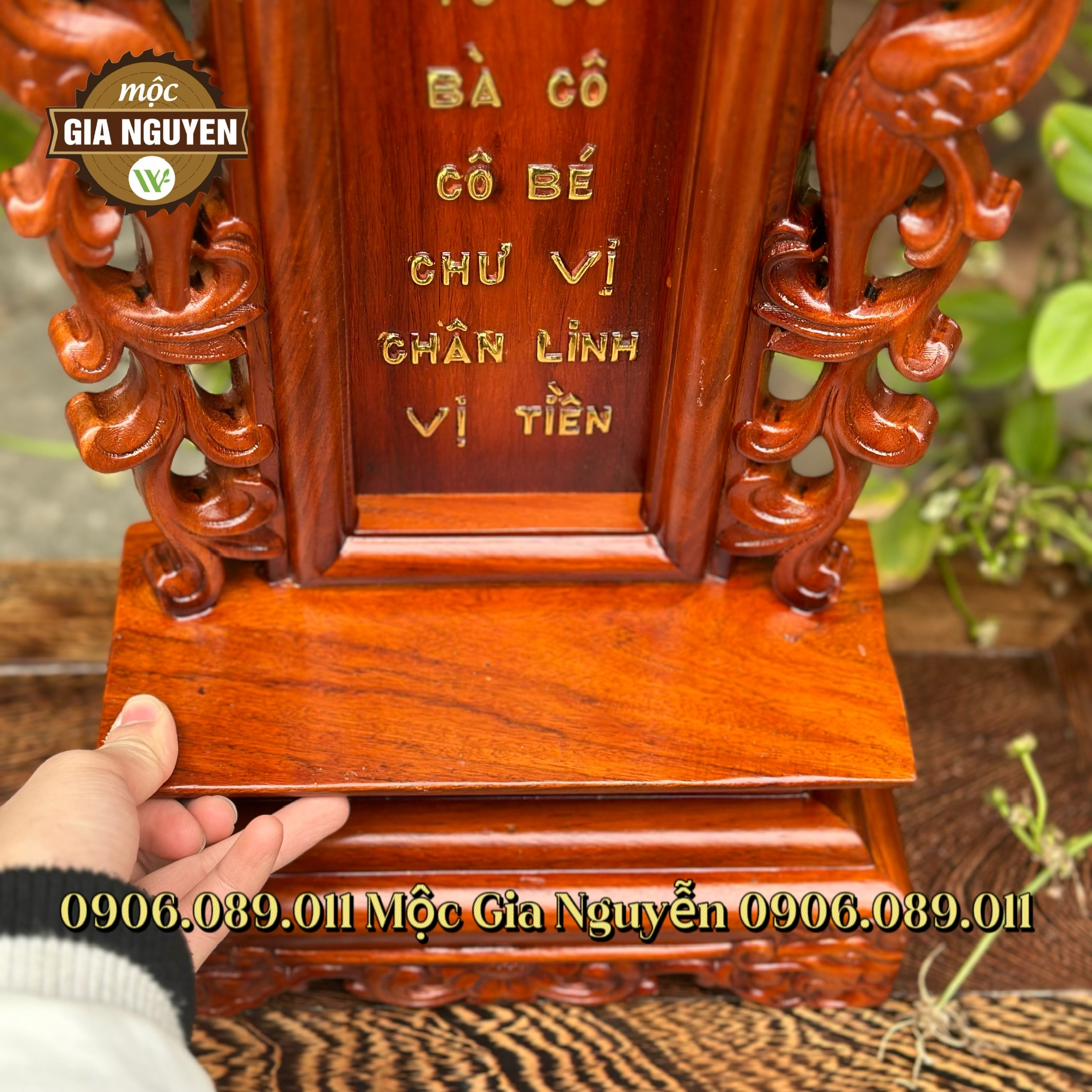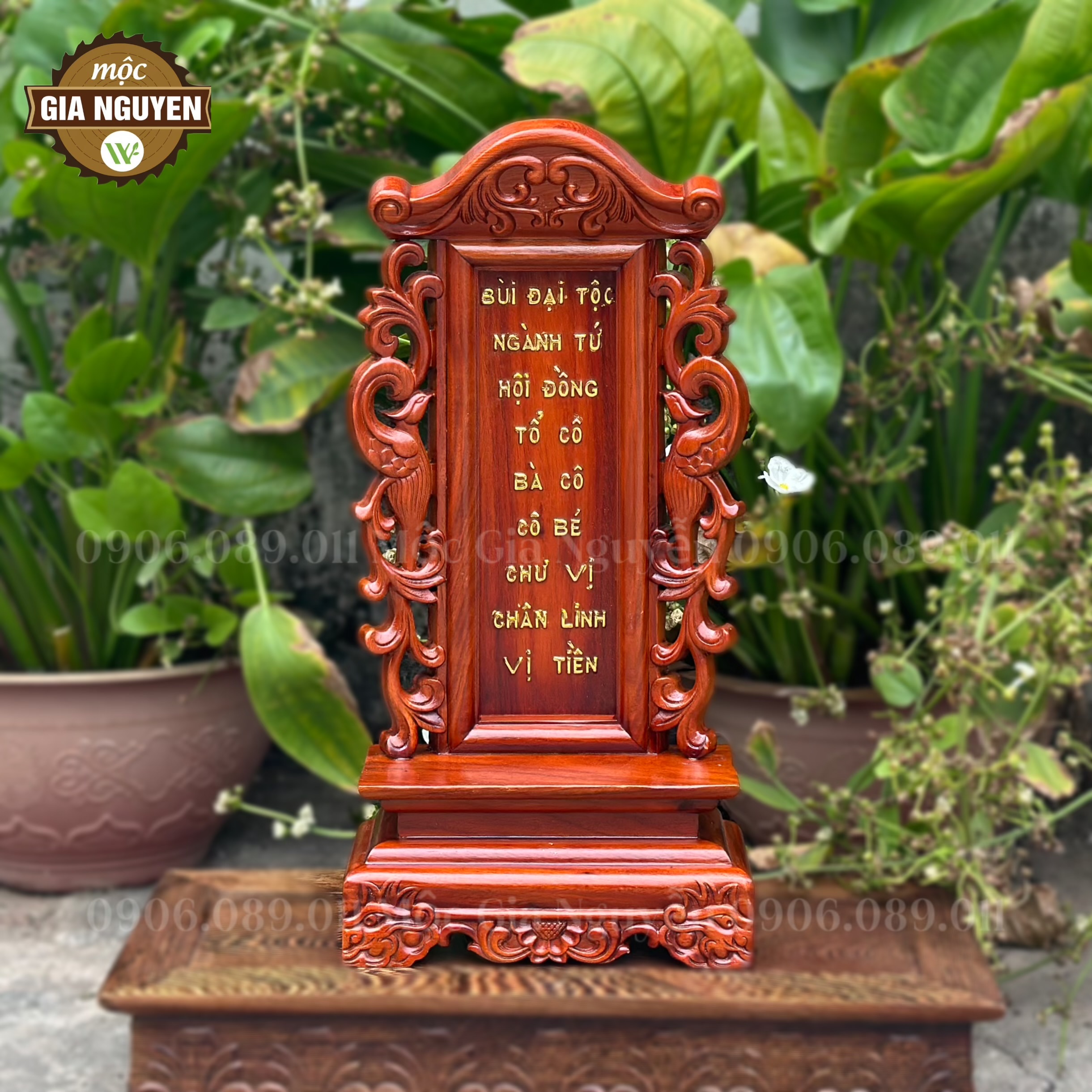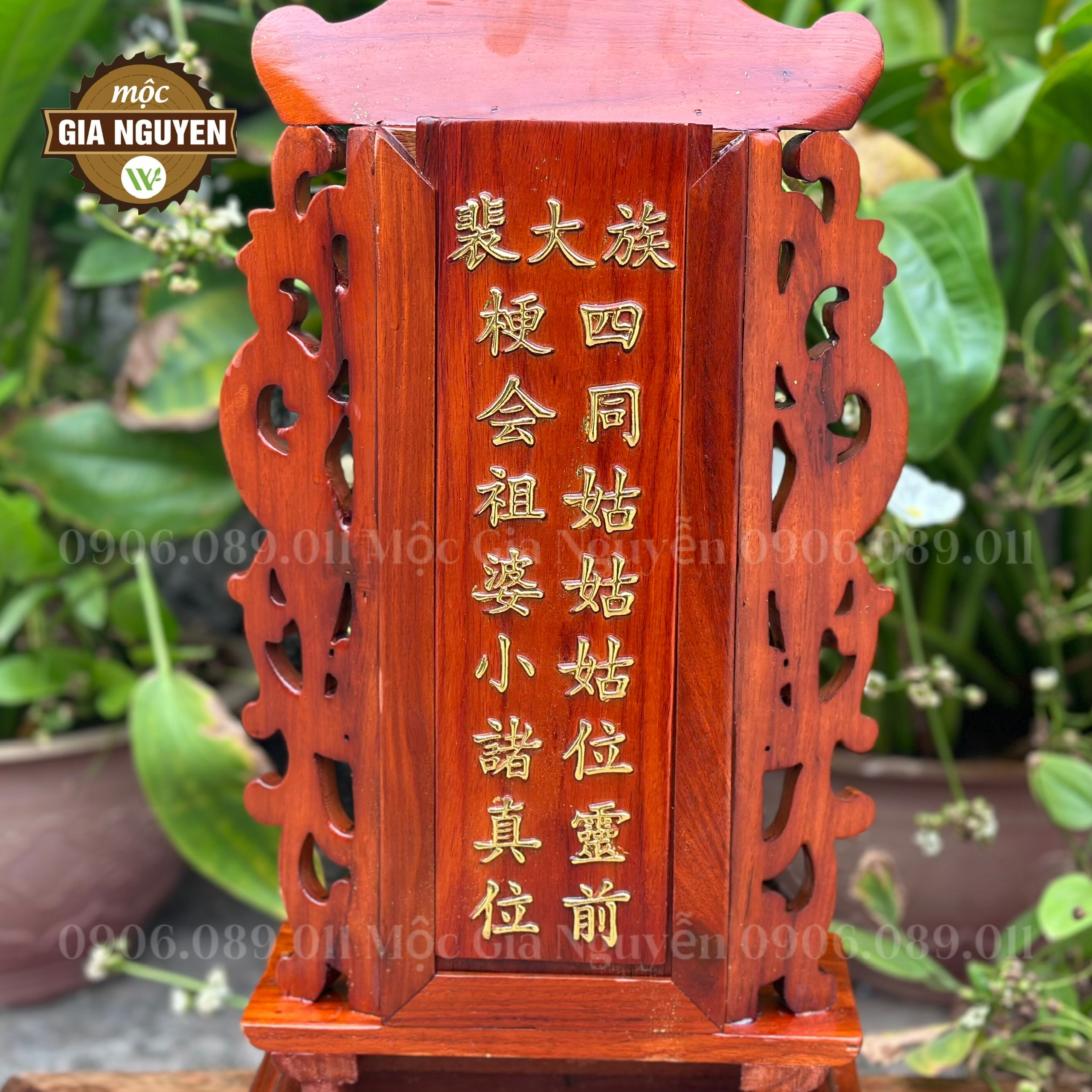 Bài vị thờ gỗ hương có thiết kế tinh xảo, độc đáo, thể hiện đẳng cấp và gu thẩm mỹ của gia chủ. Chất liệu gỗ hương tự nhiên, cứng chắc và có mùi thơm đặc trưng. Chiều cao 48cm, tạo sự trang nghiêm cho không gian thờ cúng