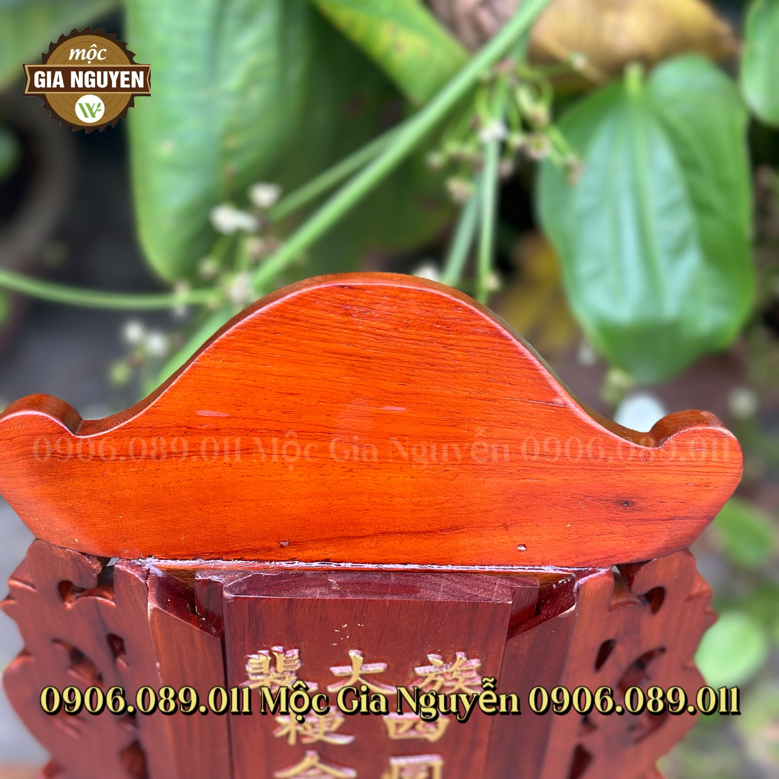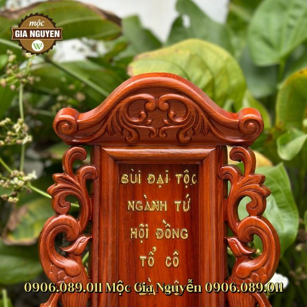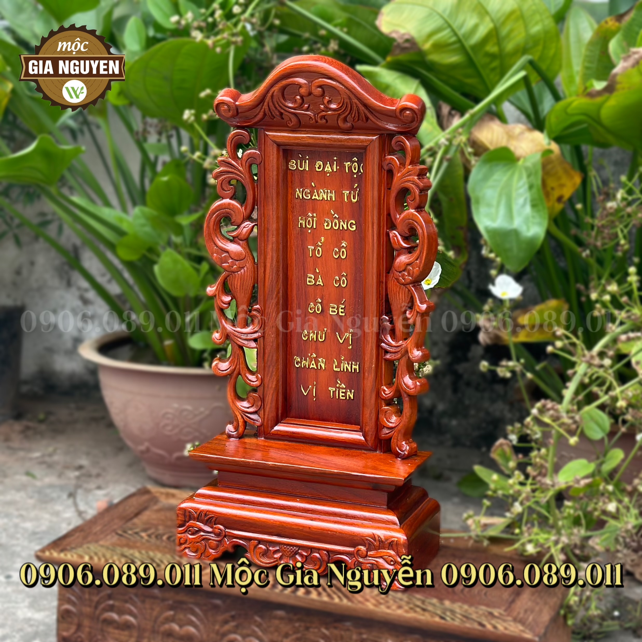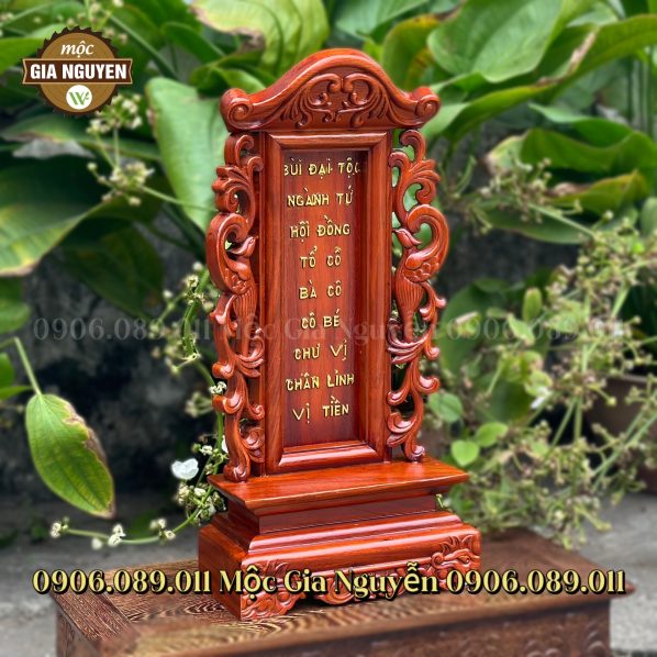 Bài vị thờ gỗ hương có thiết kế tinh xảo, độc đáo, thể hiện đẳng cấp và gu thẩm mỹ của gia chủ. Chất liệu gỗ hương tự nhiên, cứng chắc và có mùi thơm đặc trưng. Chiều cao 48cm, tạo sự trang nghiêm cho không gian thờ cúng
