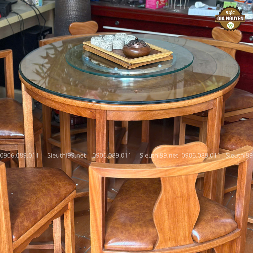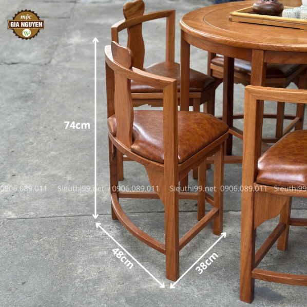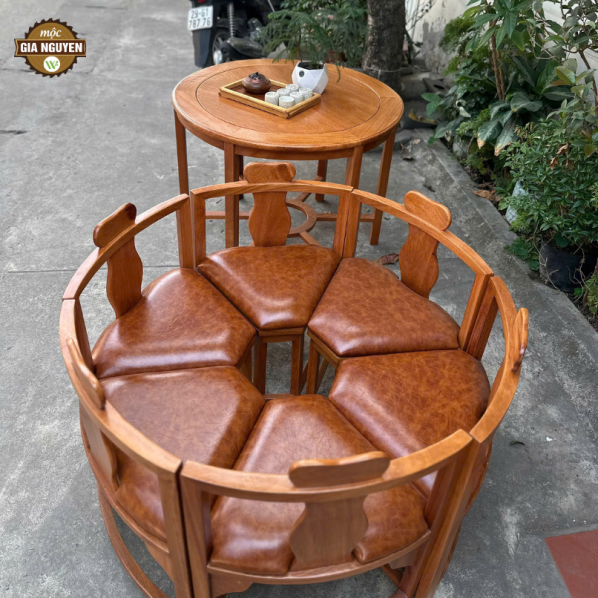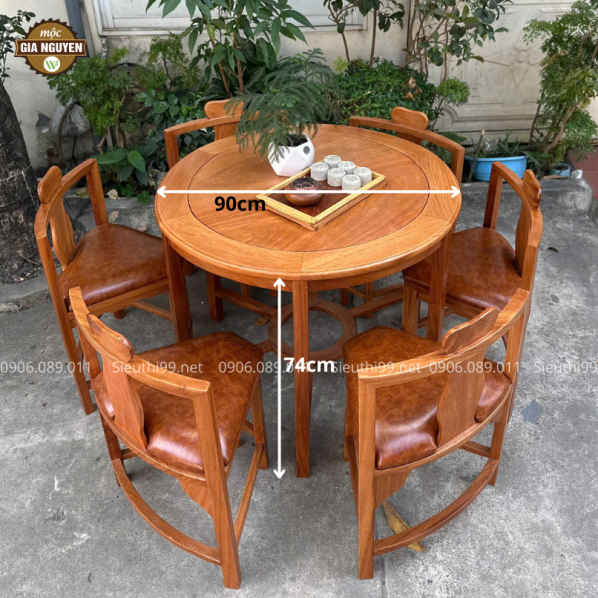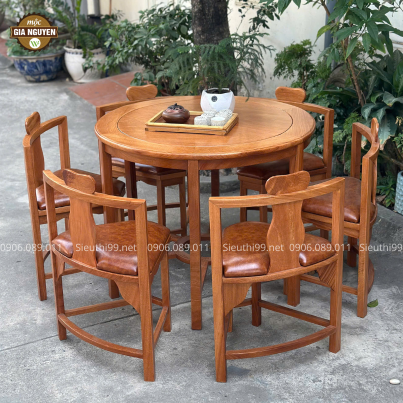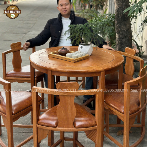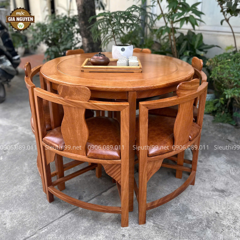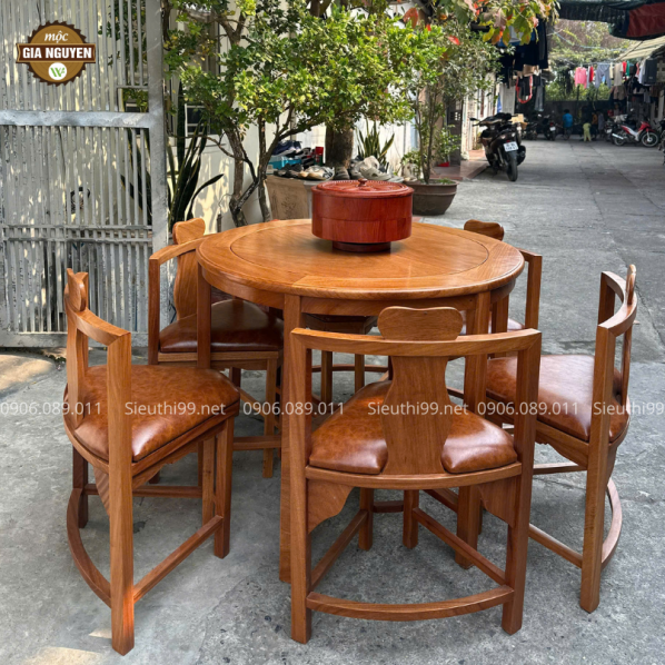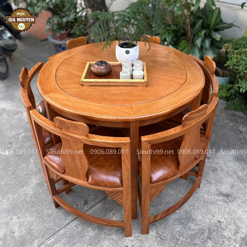 Chất liệu gỗ gõ đỏ tự nhiên: Gỗ gõ đỏ được biết đến với độ bền cao, vân gỗ đẹp mắt và màu sắc tự nhiên. Mang đến vẻ đẹp sang trọng và ấm áp cho không gian. Thiết kế tinh tế, hiện đại: Bộ bàn ghế có thiết kế tròn độc đáo, tạo cảm giác mềm mại và hài hòa.