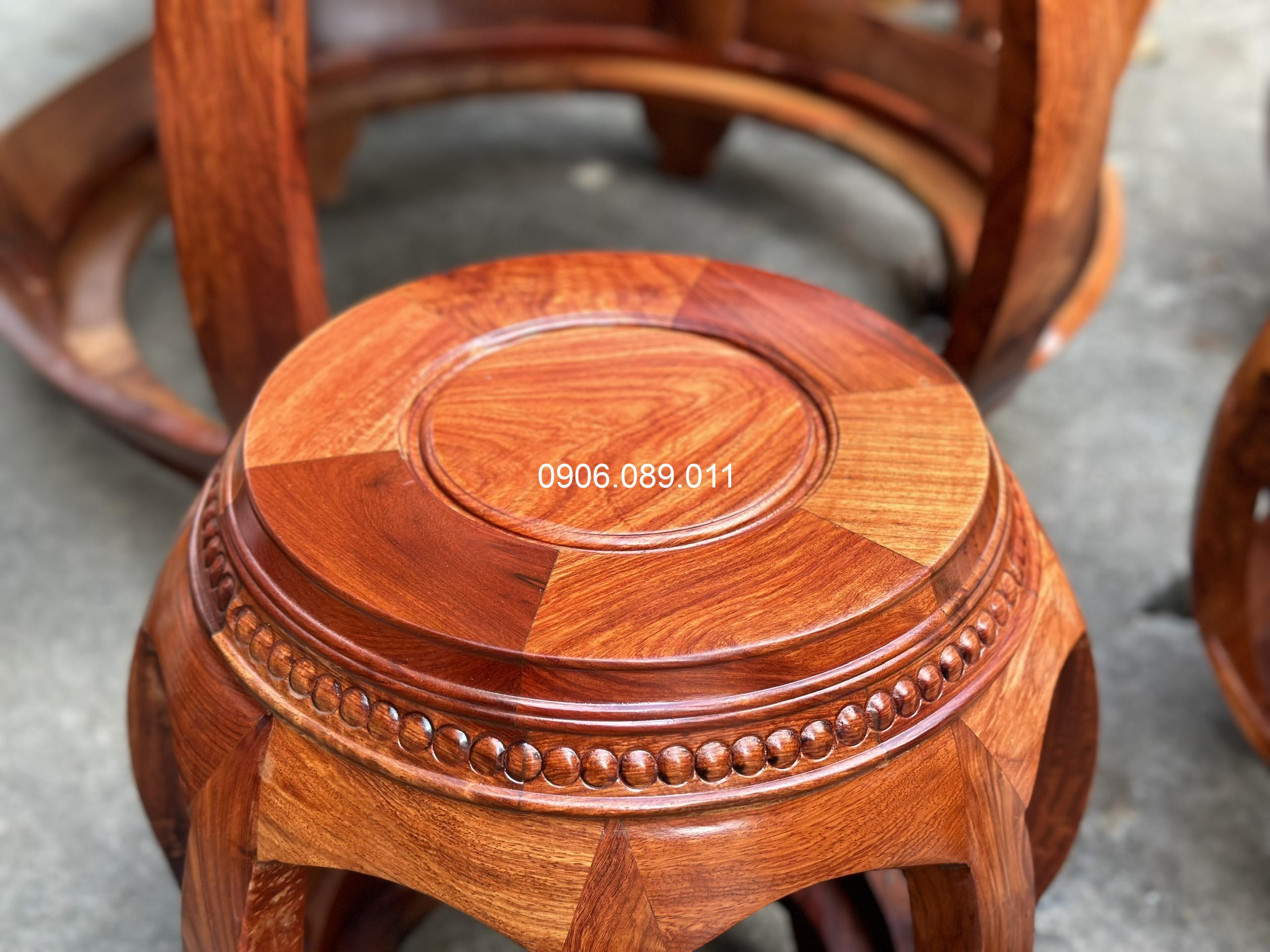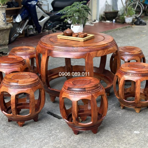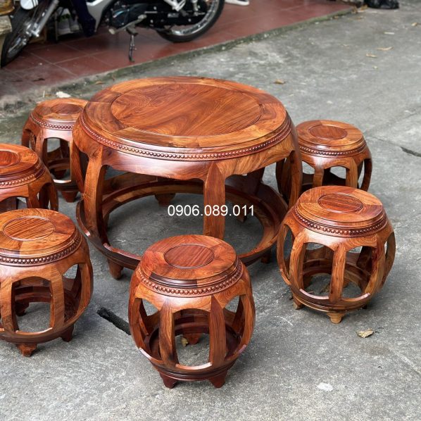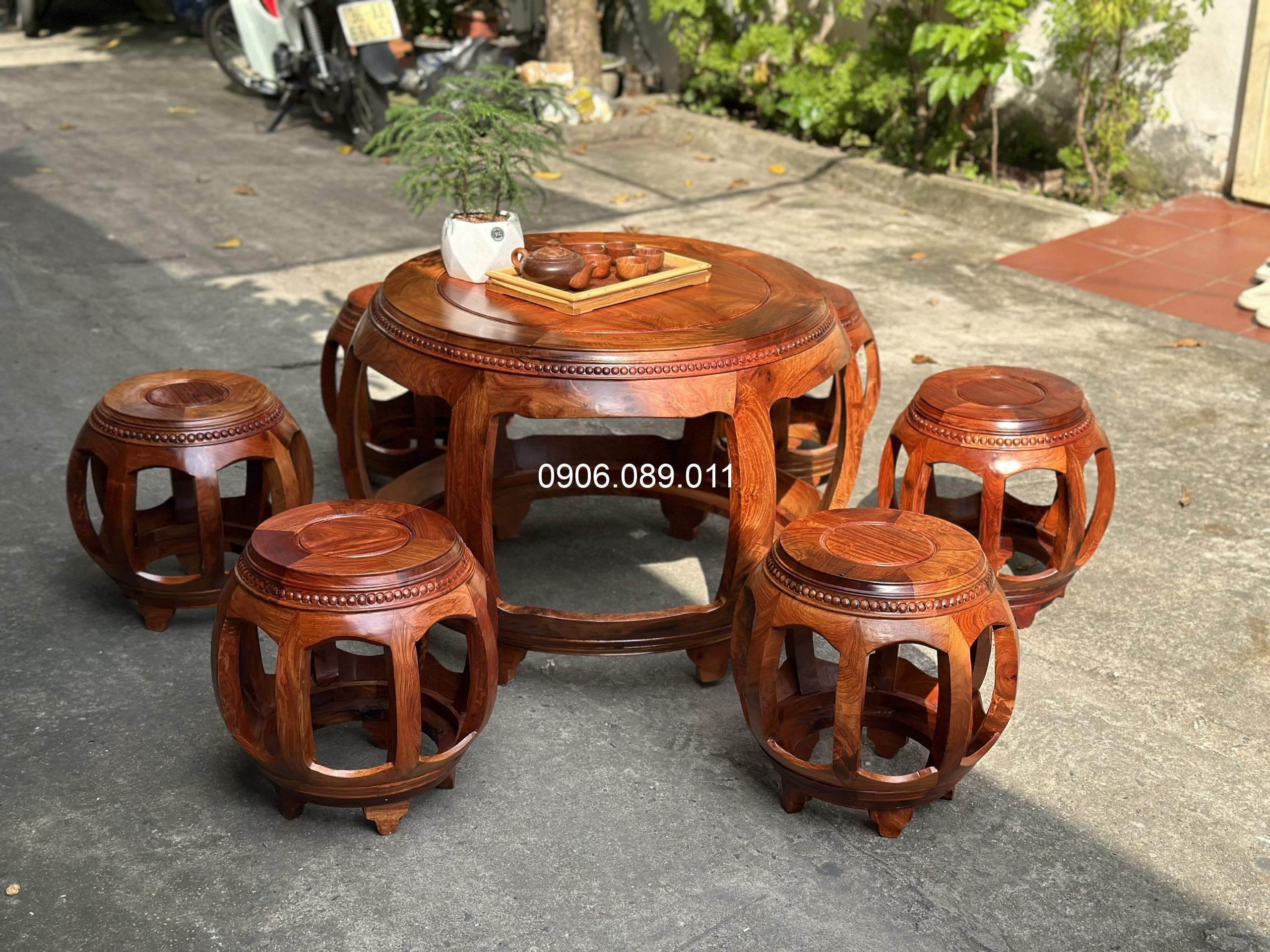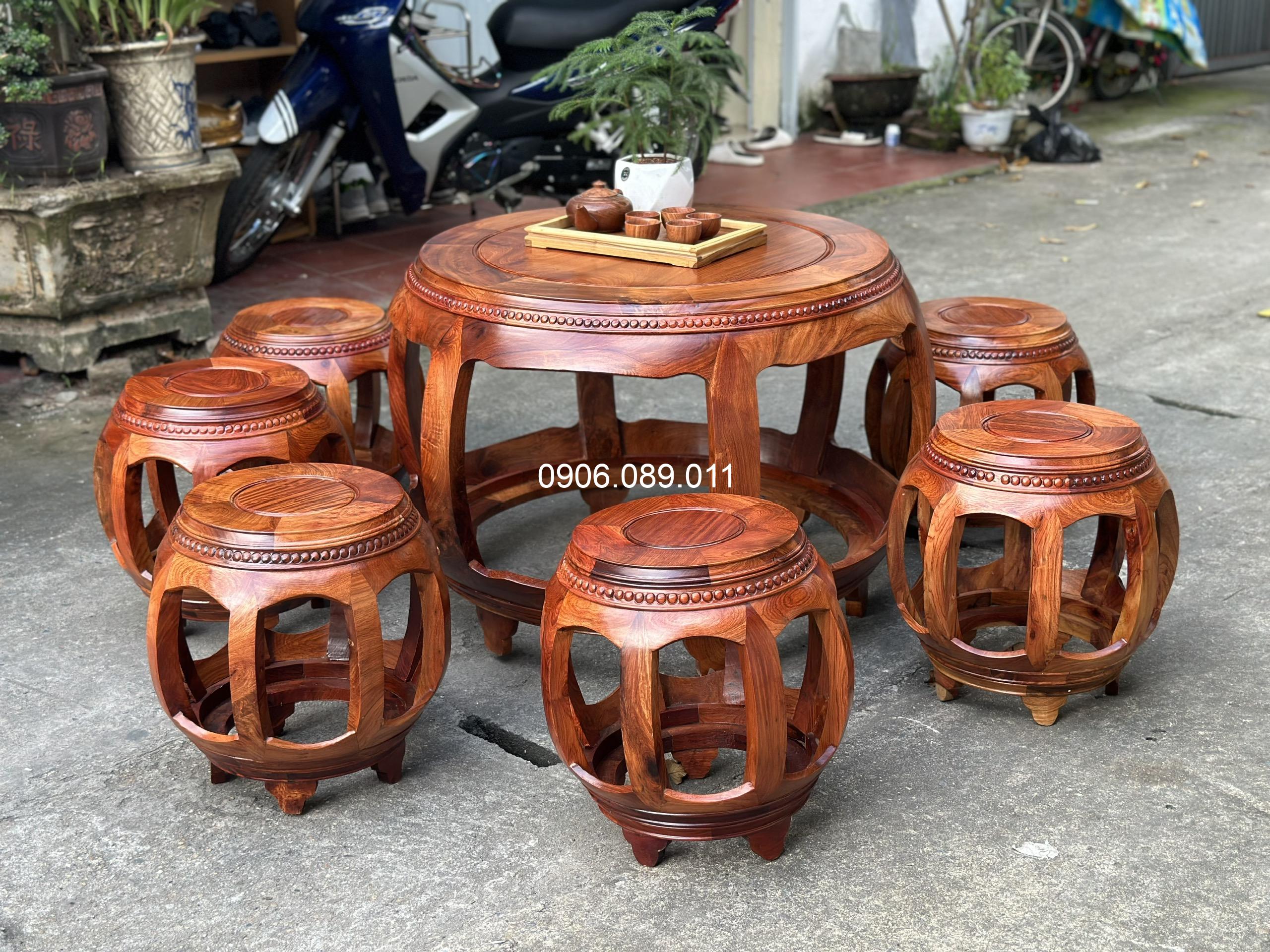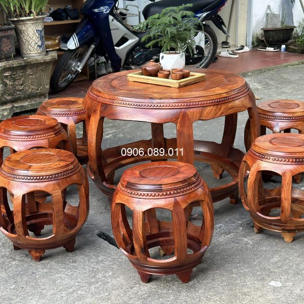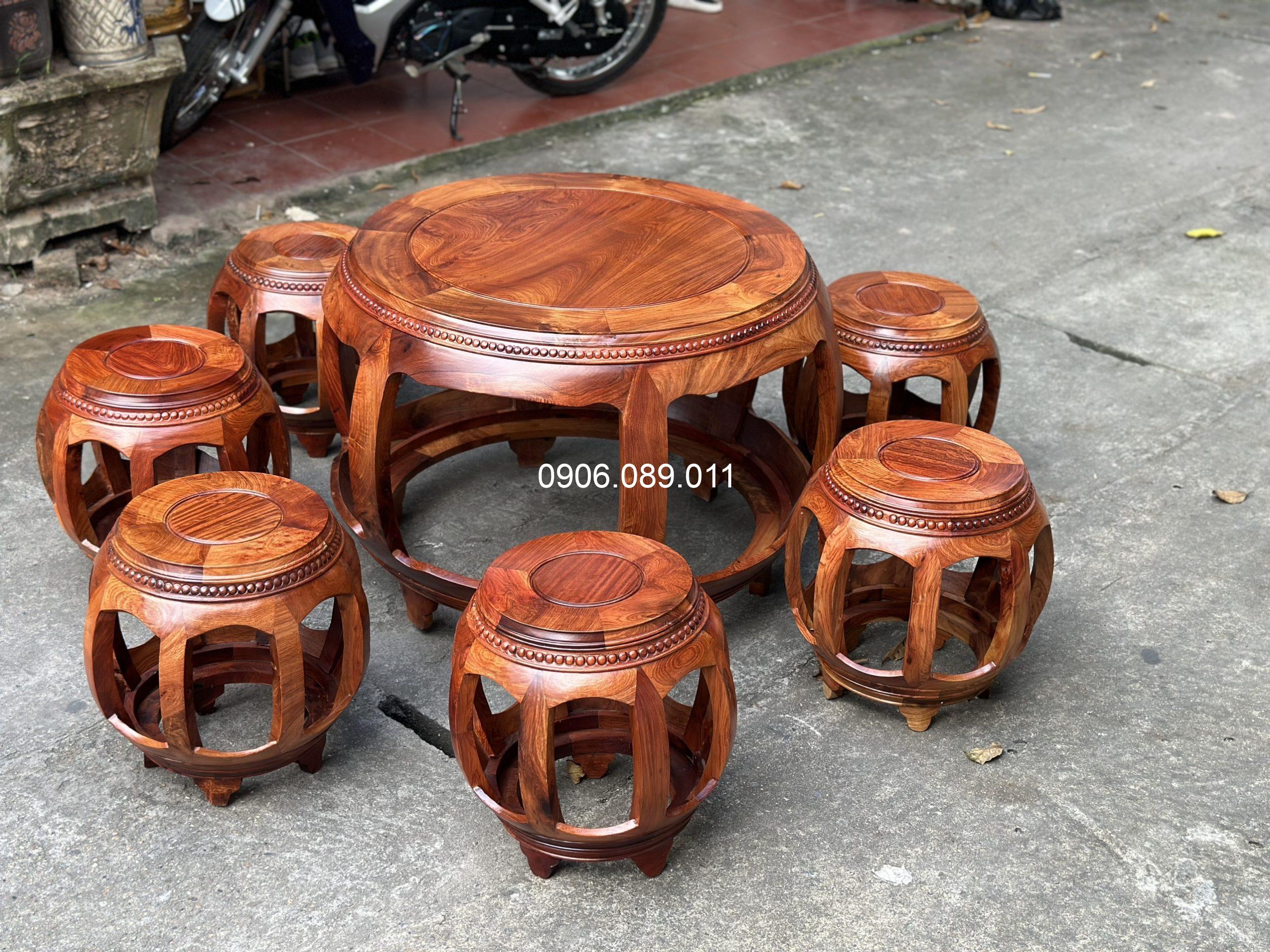 Bộ đôn trống gỗ hương bao gồm : bàn đôn (bao gồm mặt kính) : đường kính 75cm, 65cm; ghế đôn : cao 42cm; mặt 30cm.