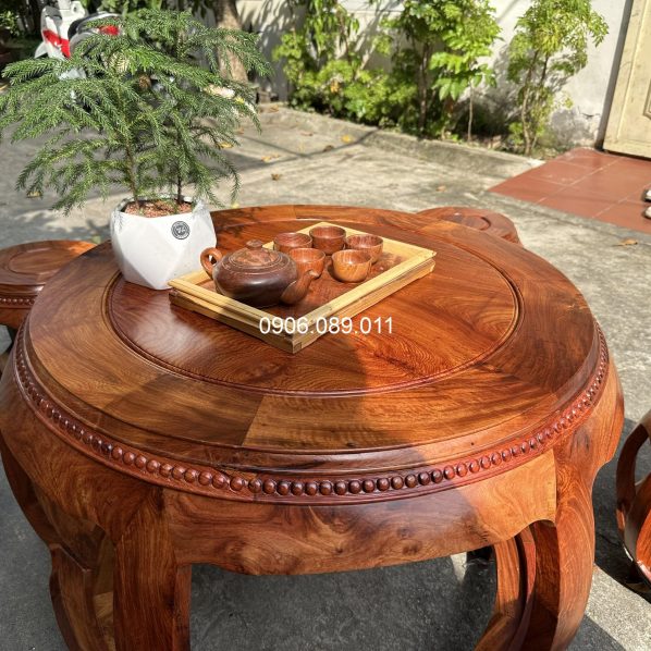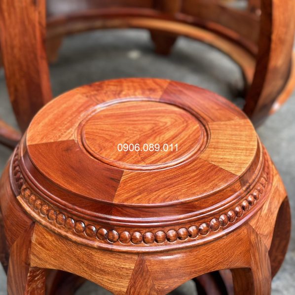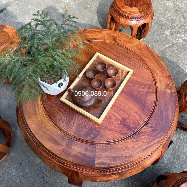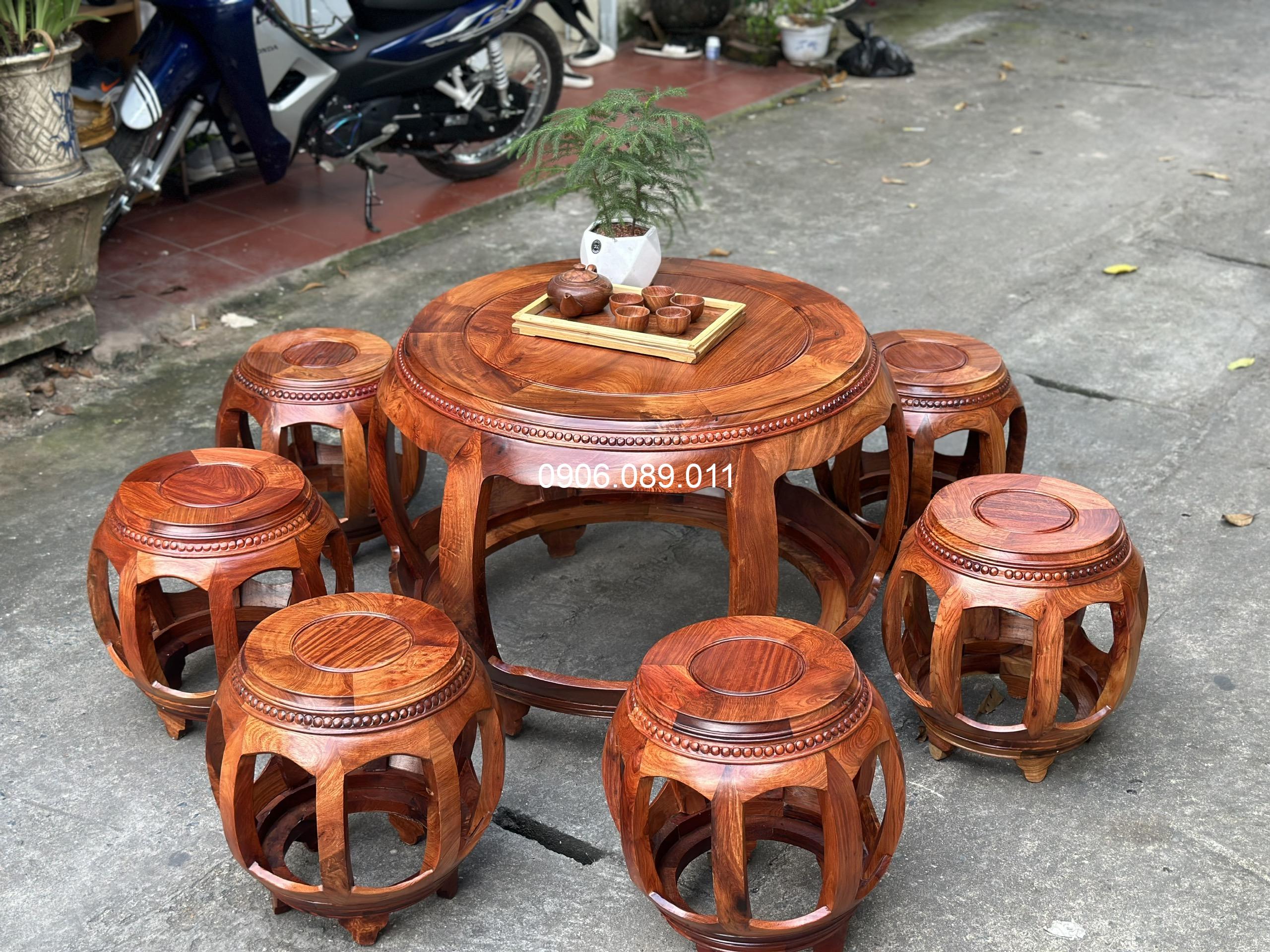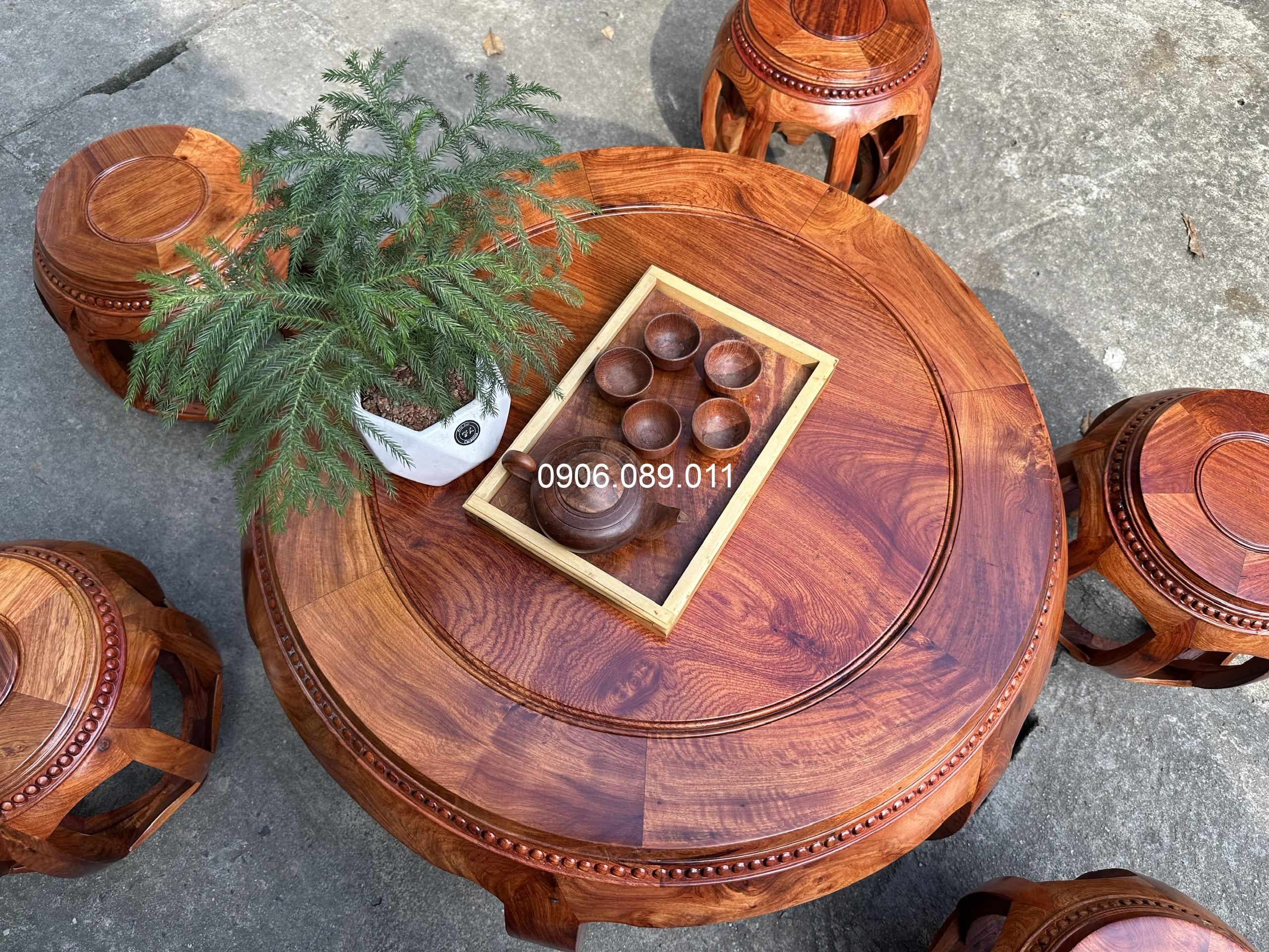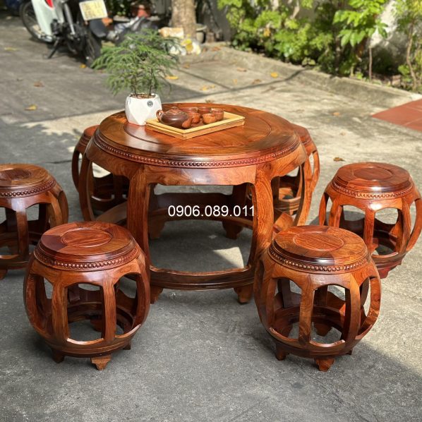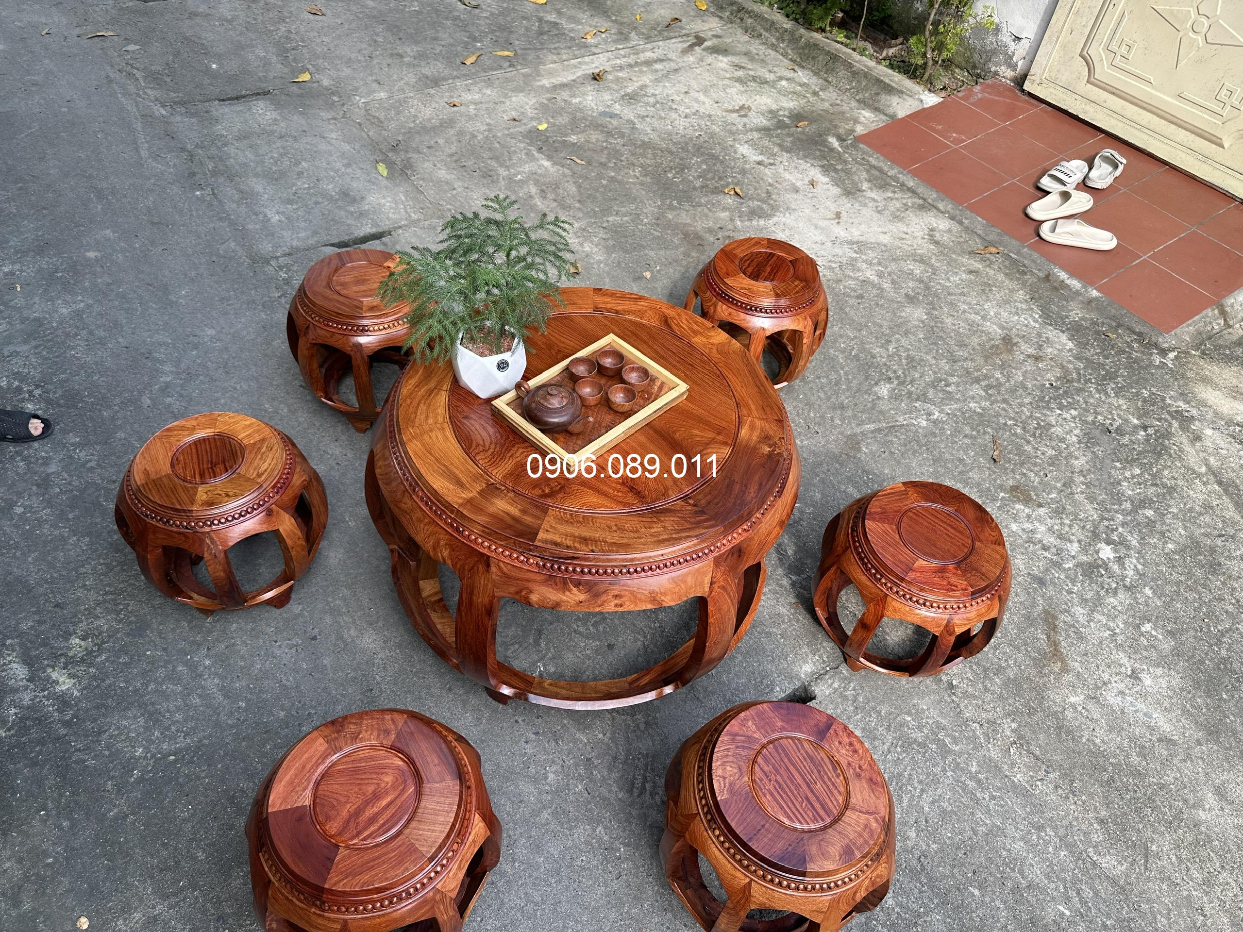Bộ đôn trống gỗ hương bao gồm : bàn đôn (bao gồm mặt kính) : đường kính 75cm, 65cm; ghế đôn : cao 42cm; mặt 30cm.