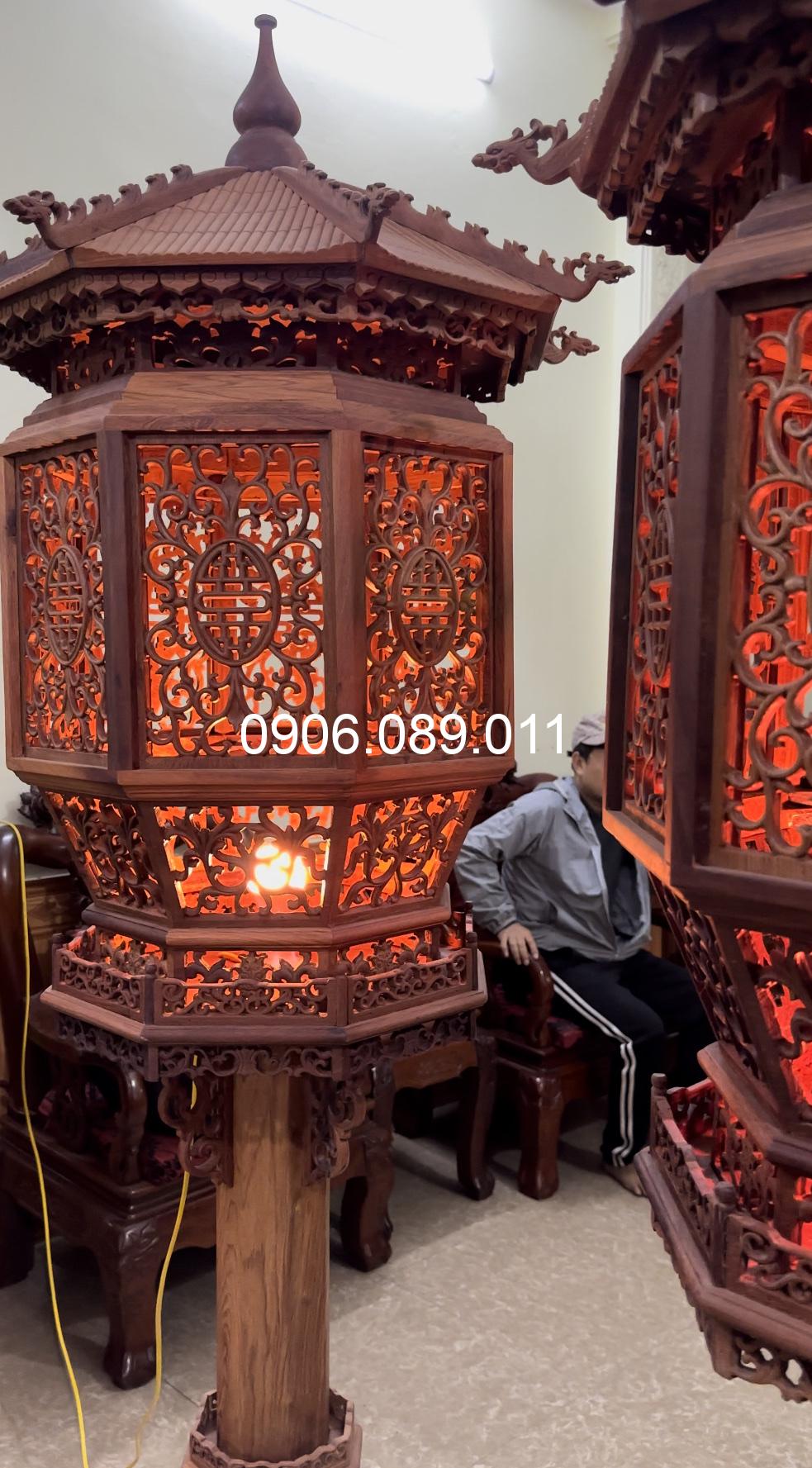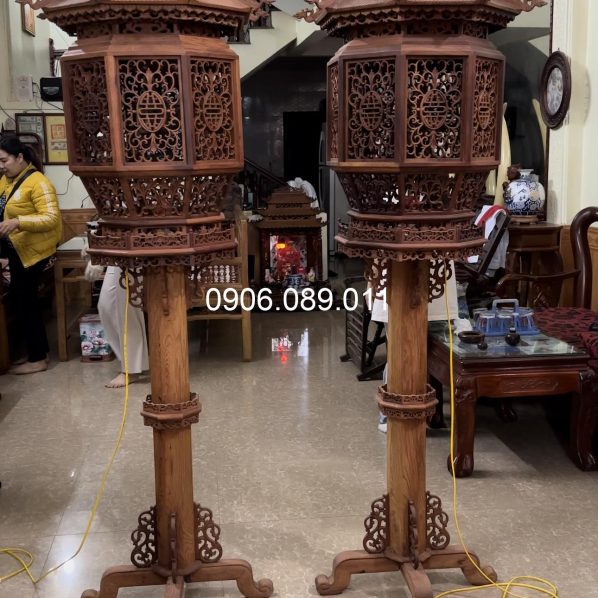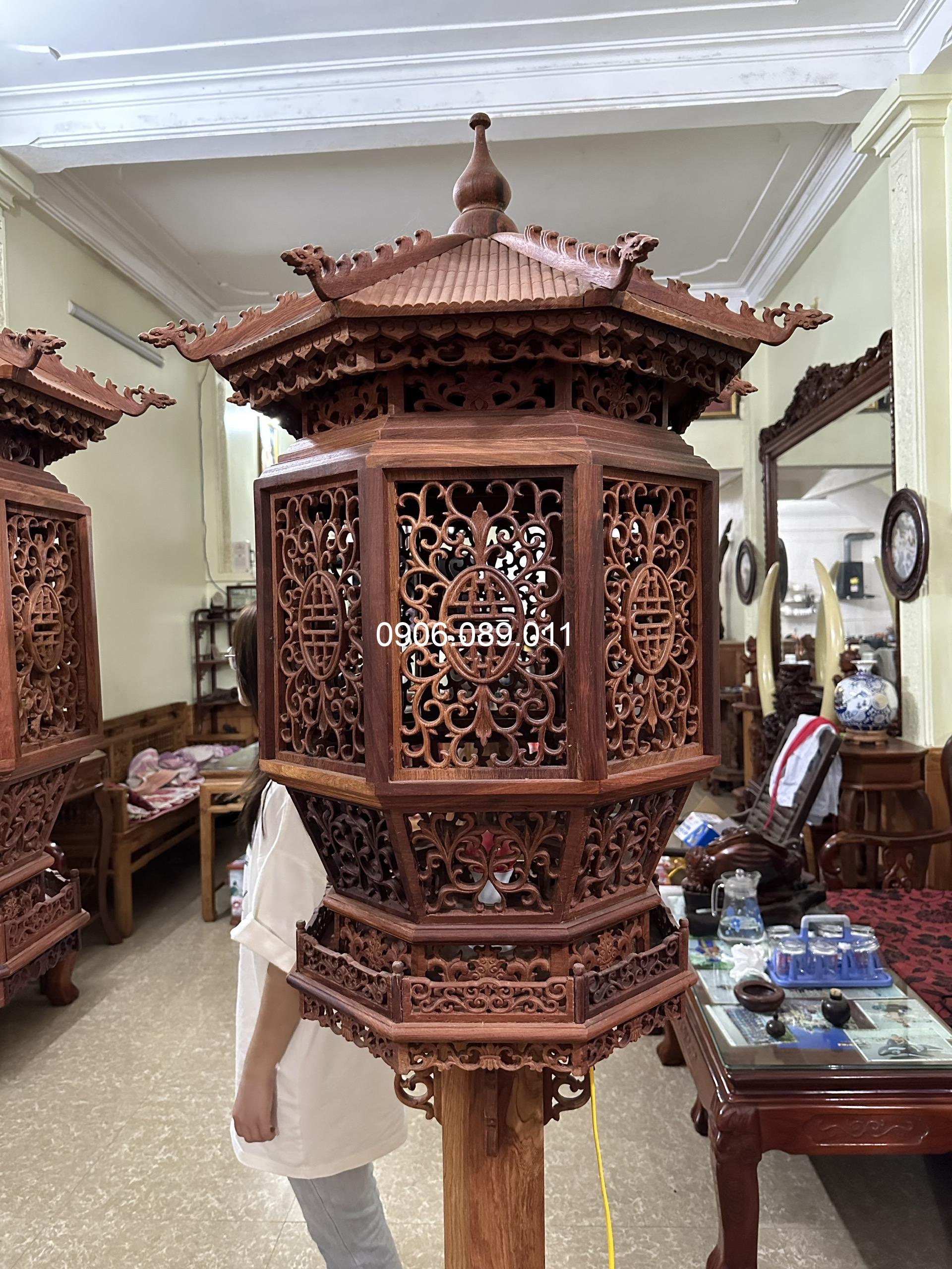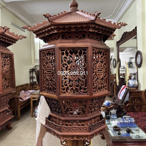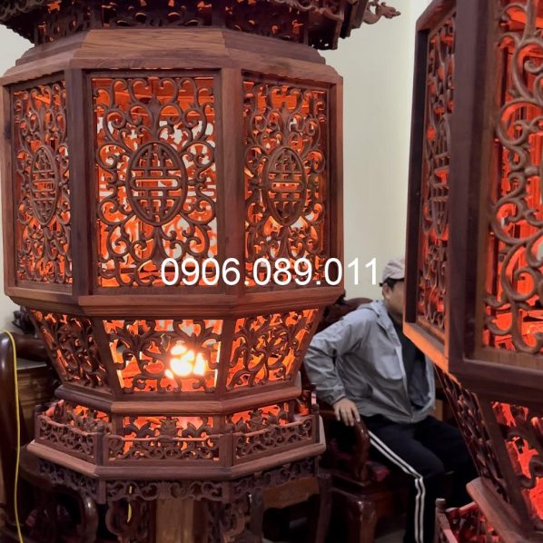 - Dưới mái đèn là hoa văn được trạm trổ sắc nét, xung quanh là chữ thọ, và là điểm nhấn của đôi đèn trở nên sang trọng, đẳng cấp hơn.