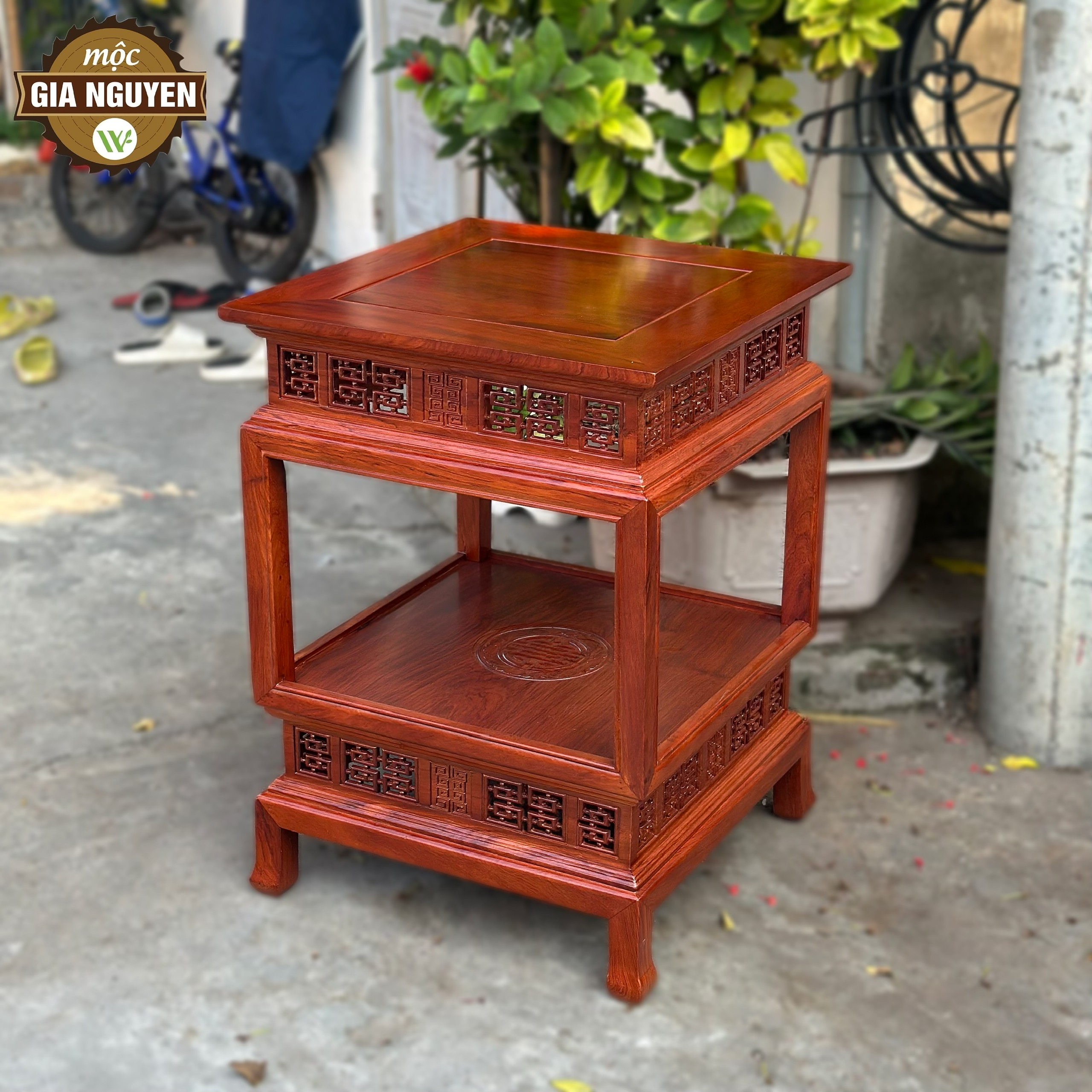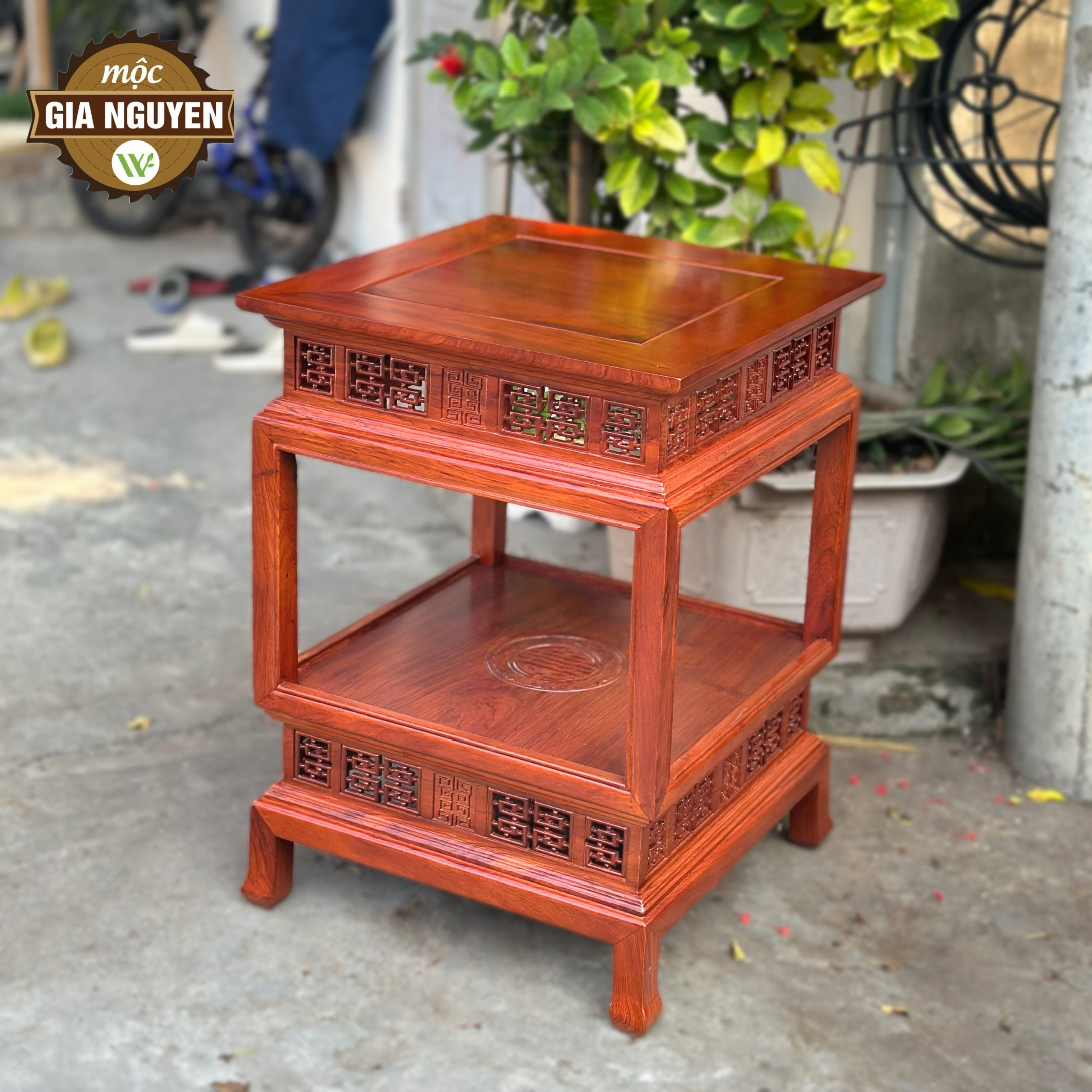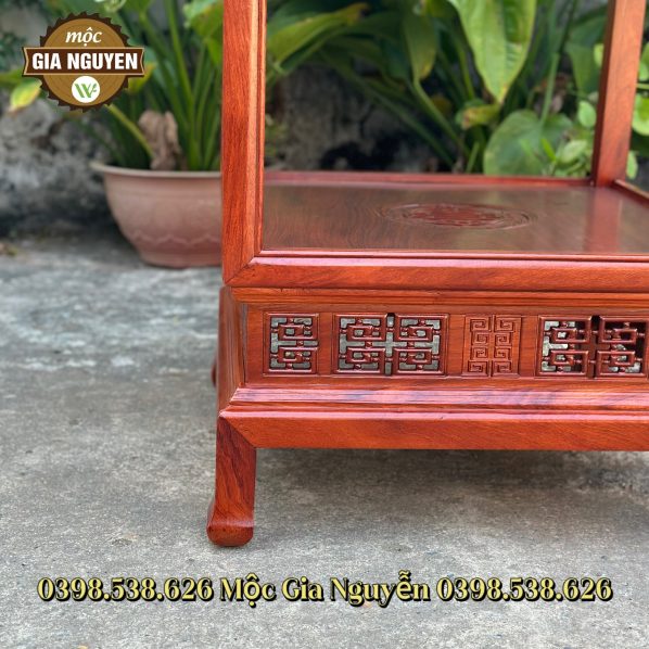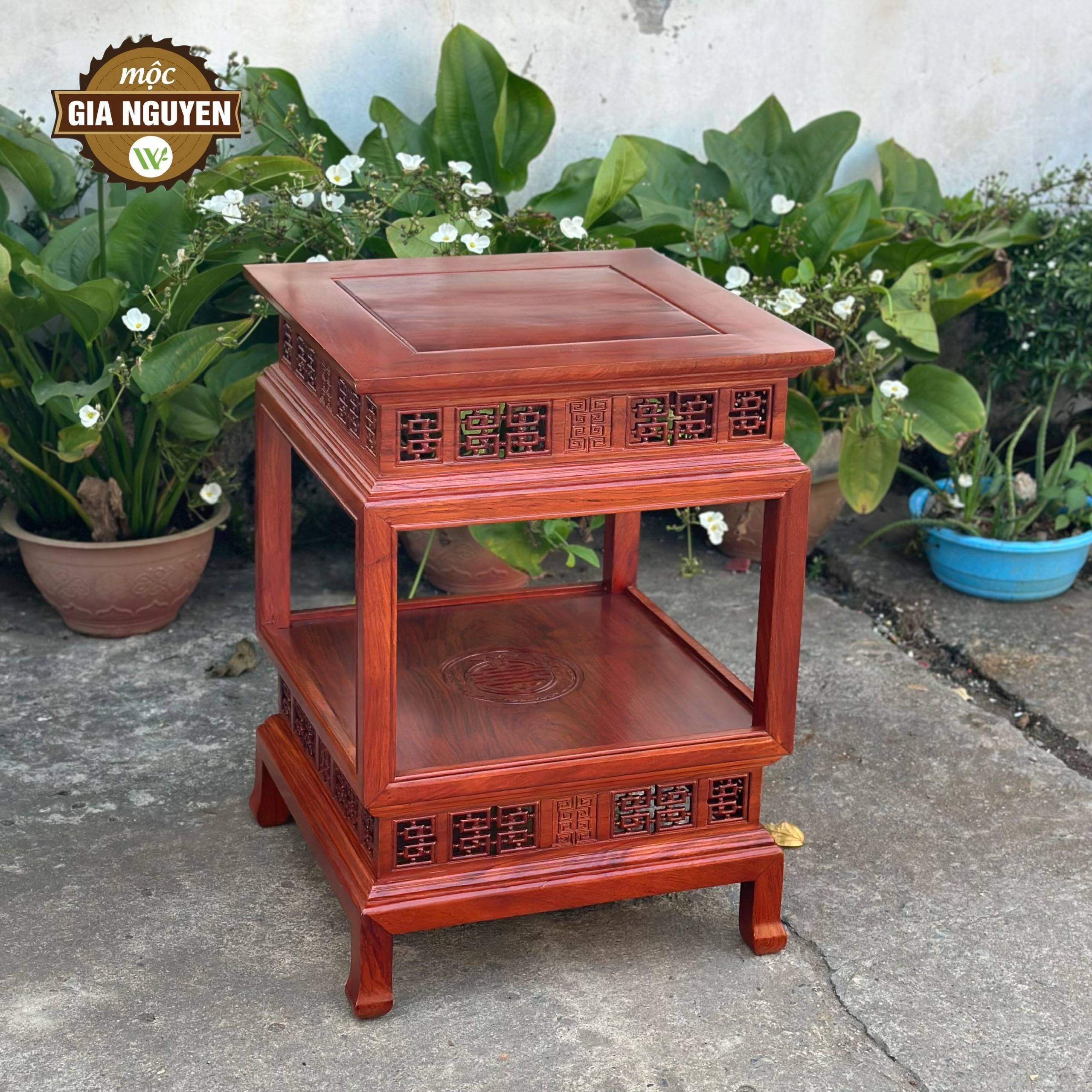Đôn đèn gỗ hương được thiết kế đơn giản nhưng vẫn sang trọng và đẳng cấp. Với thiết kế 2 tầng giúp gia chủ có thể kê thêm nhiều vật phẩm hơn nữa.