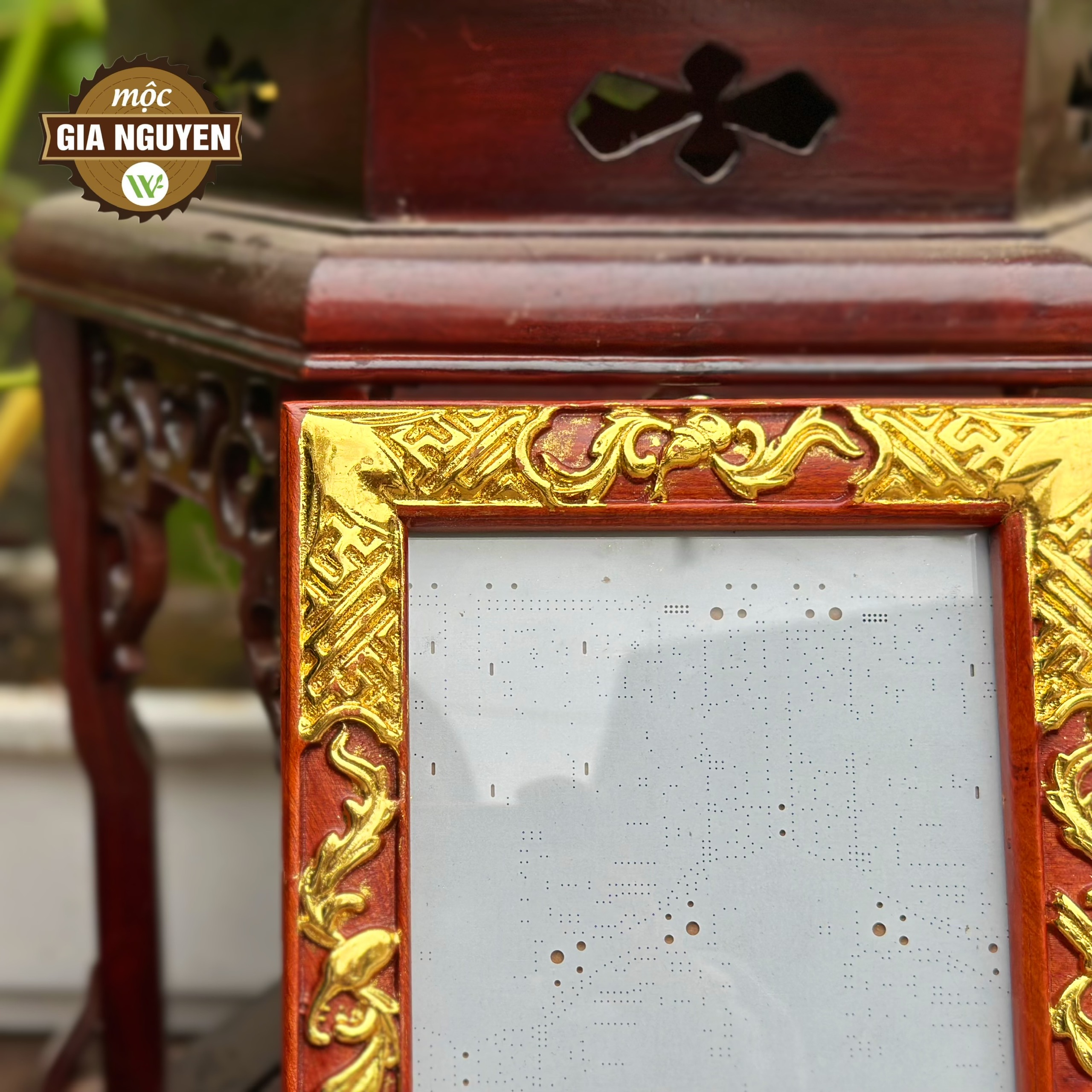 Khung ảnh thờ treo đục cuốn thư dát vàng gỗ hương 18x24cm là sản phẩm độc đáo của làng gỗ Đồng Kỵ. Khung ảnh thờ gỗ hương được làm từ gỗ hương, là một loại gỗ quý bởi nó tiết ra một mũi thơm đặc trưng, riêng biệt mà không loại gỗ nào có được.