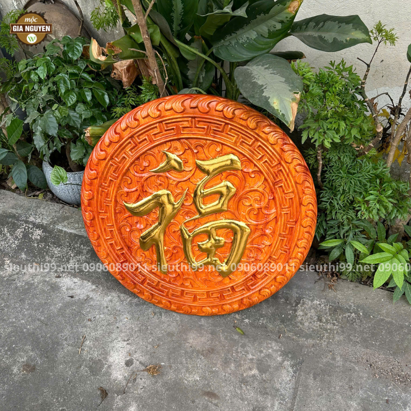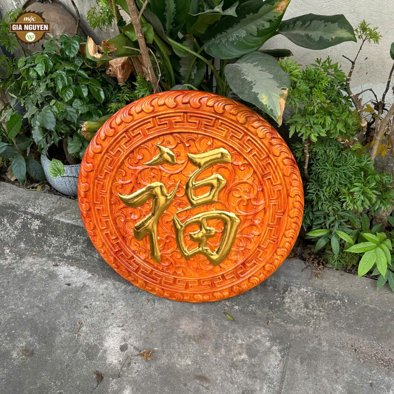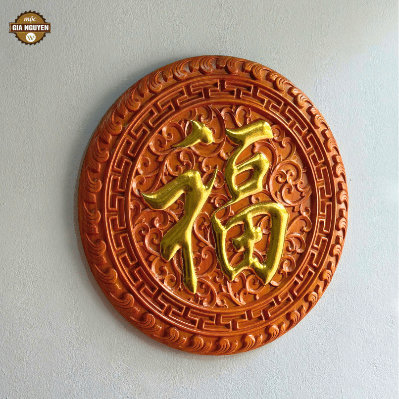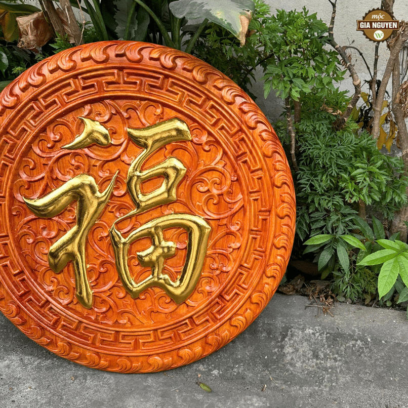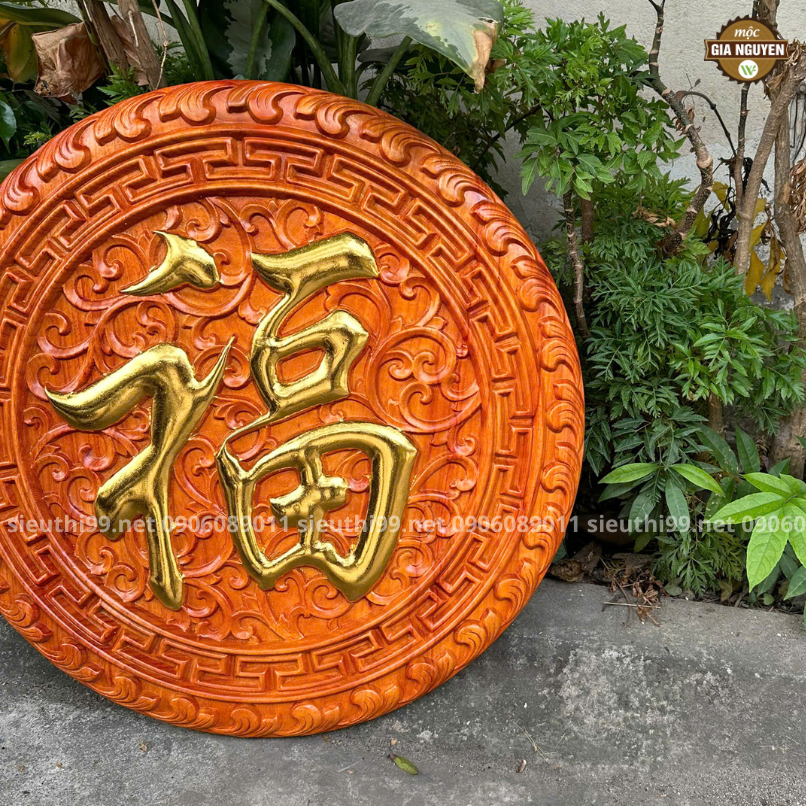 Tranh Chữ Phúc Nguyên Khối Gỗ Hương Dát Vàng 60cm TC01