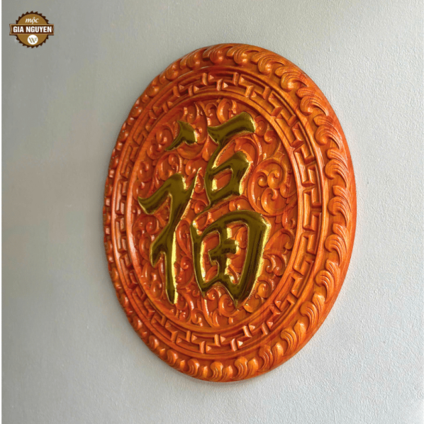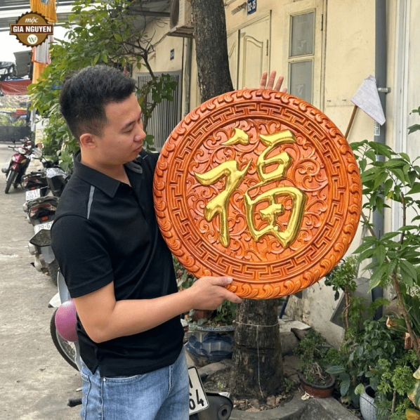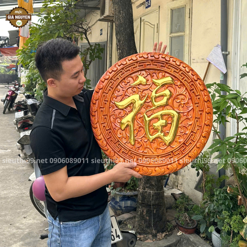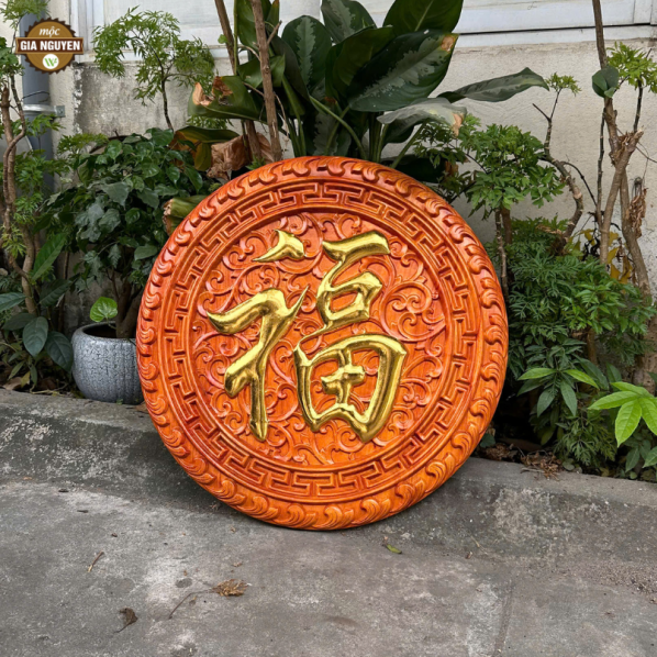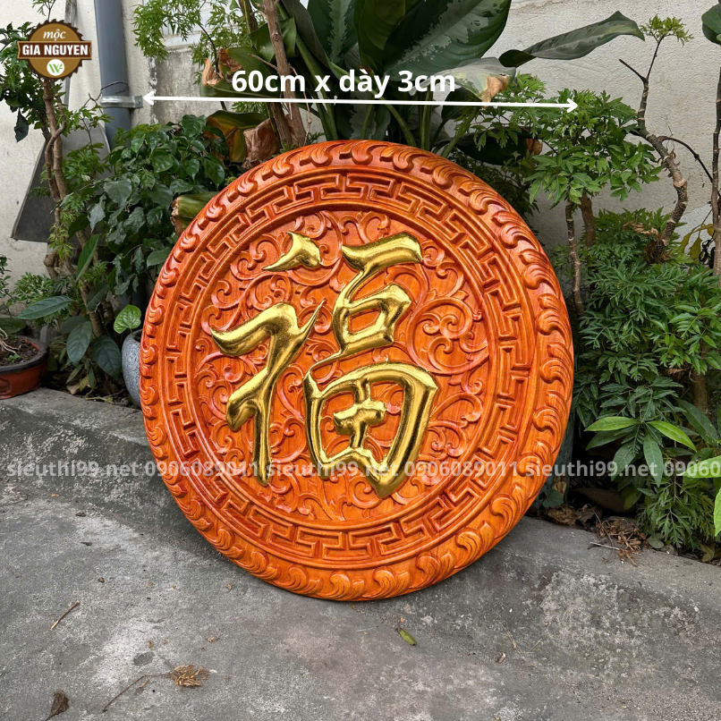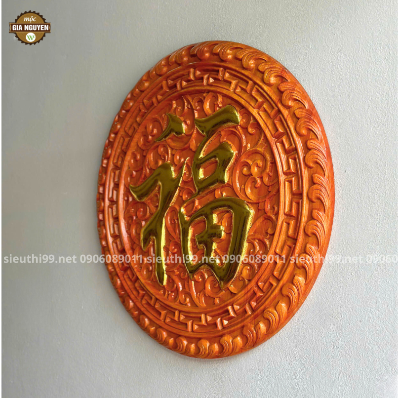 Tranh Chữ Phúc Nguyên Khối Gỗ Hương Dát Vàng 60cm TC01