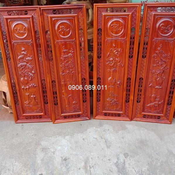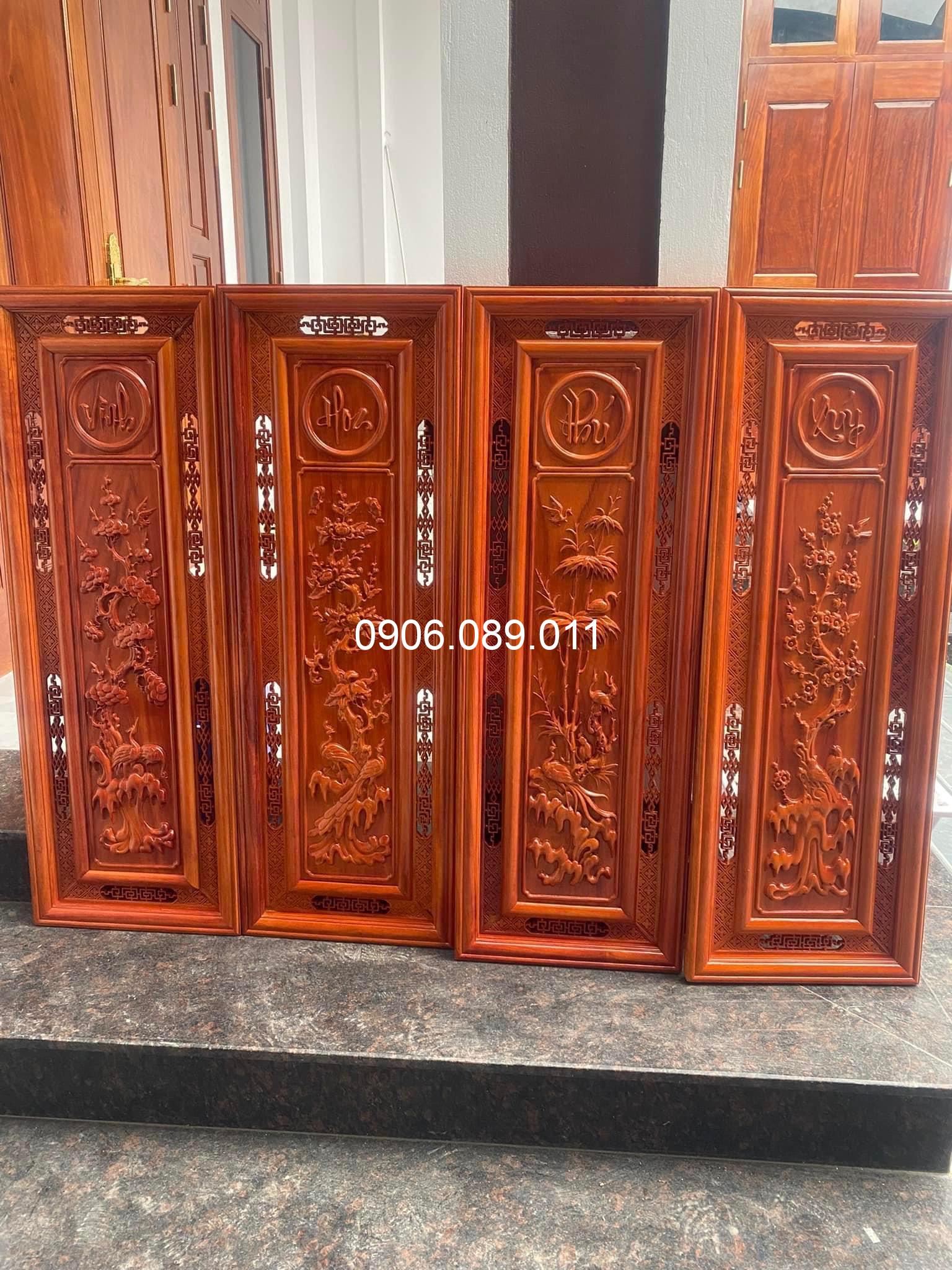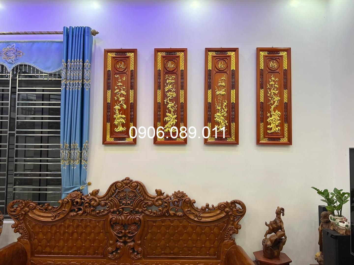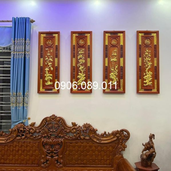 - Tranh được làm từ chất liệu gỗ hương nguyên tấm, sản phẩm được tẩm sấy kĩ thuật cao theo quy chuẩn không cong vênh mối mọt. Bộ tranh gỗ tứ quý được dát vàng, tạo những điểm nhấn sang trọng khiến bức tranh trở nên sang trọng, mang ý nghĩa phong thủy sâu sắc vượng tài lộc cho gia chủ.