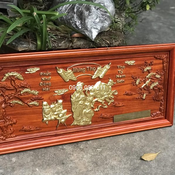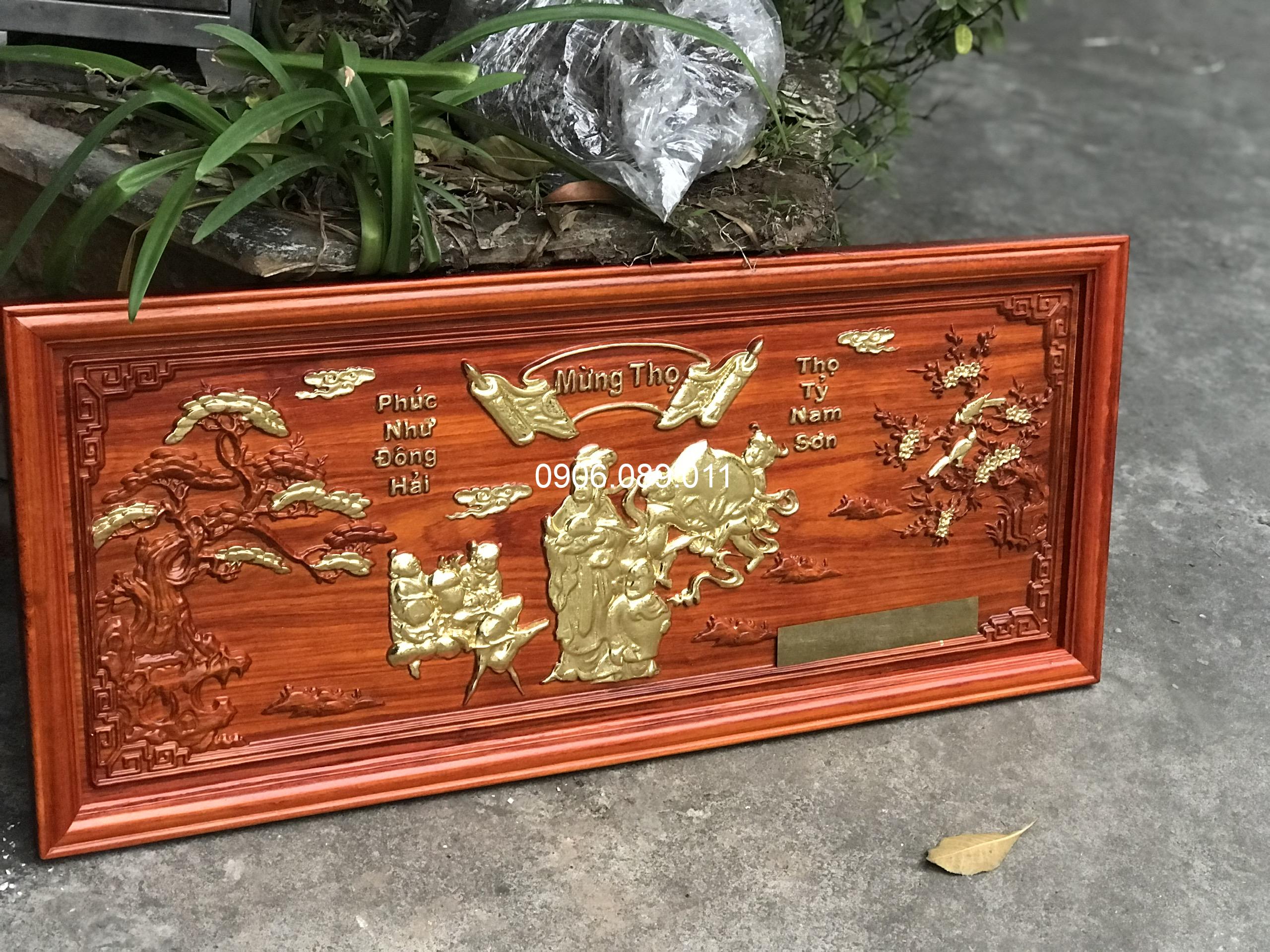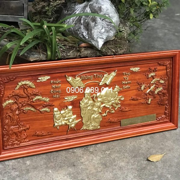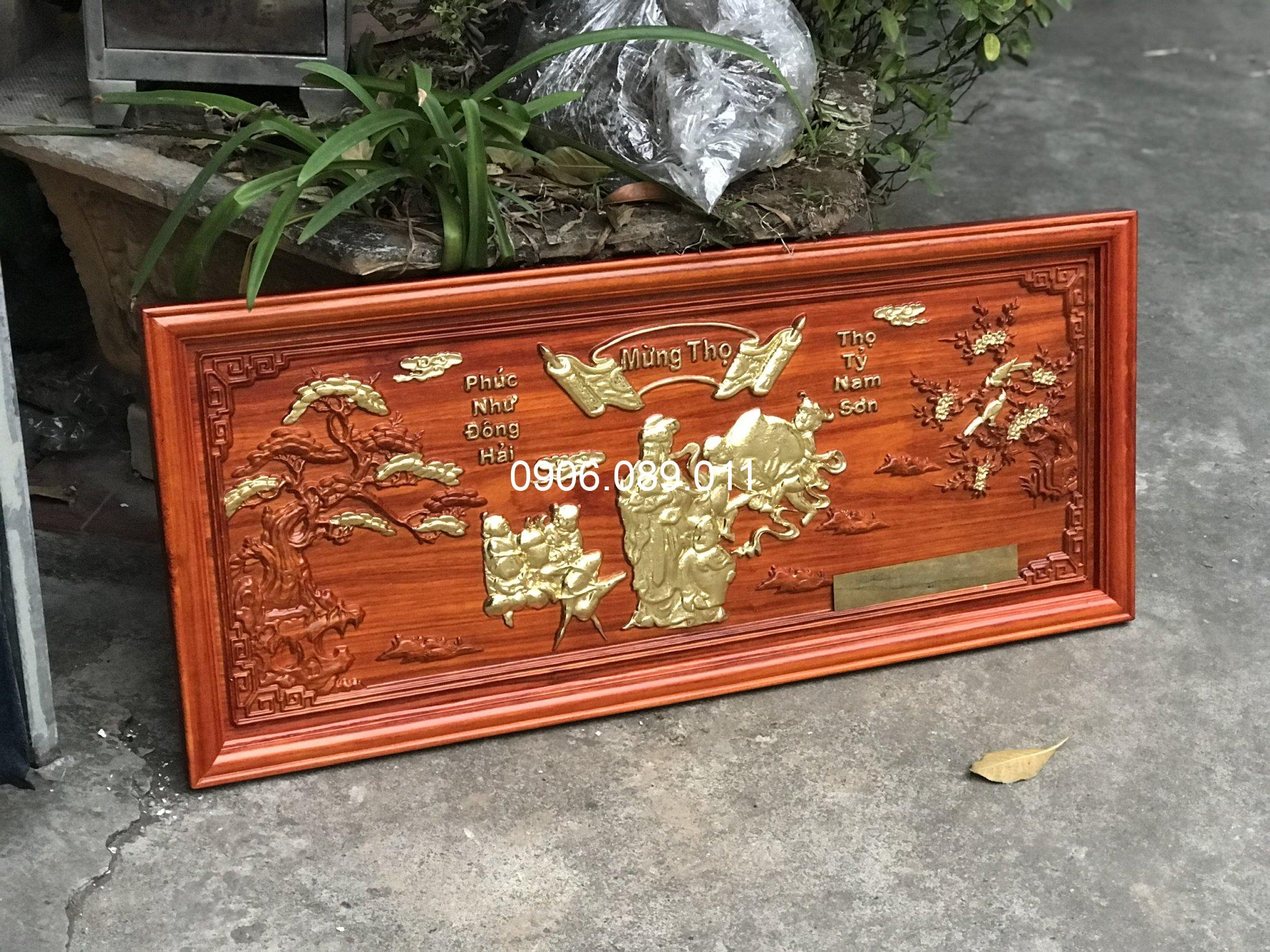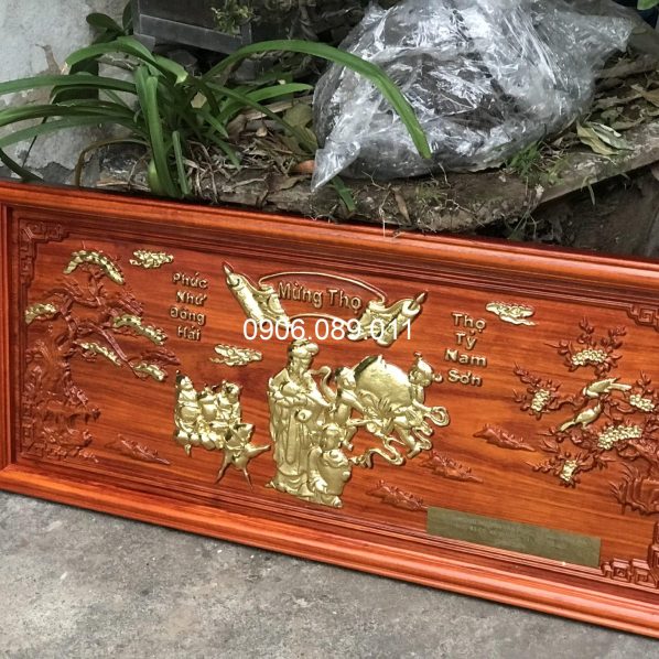 Tranh mừng thọ bà gỗ hương dát vàng 47x107cm