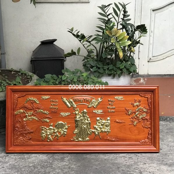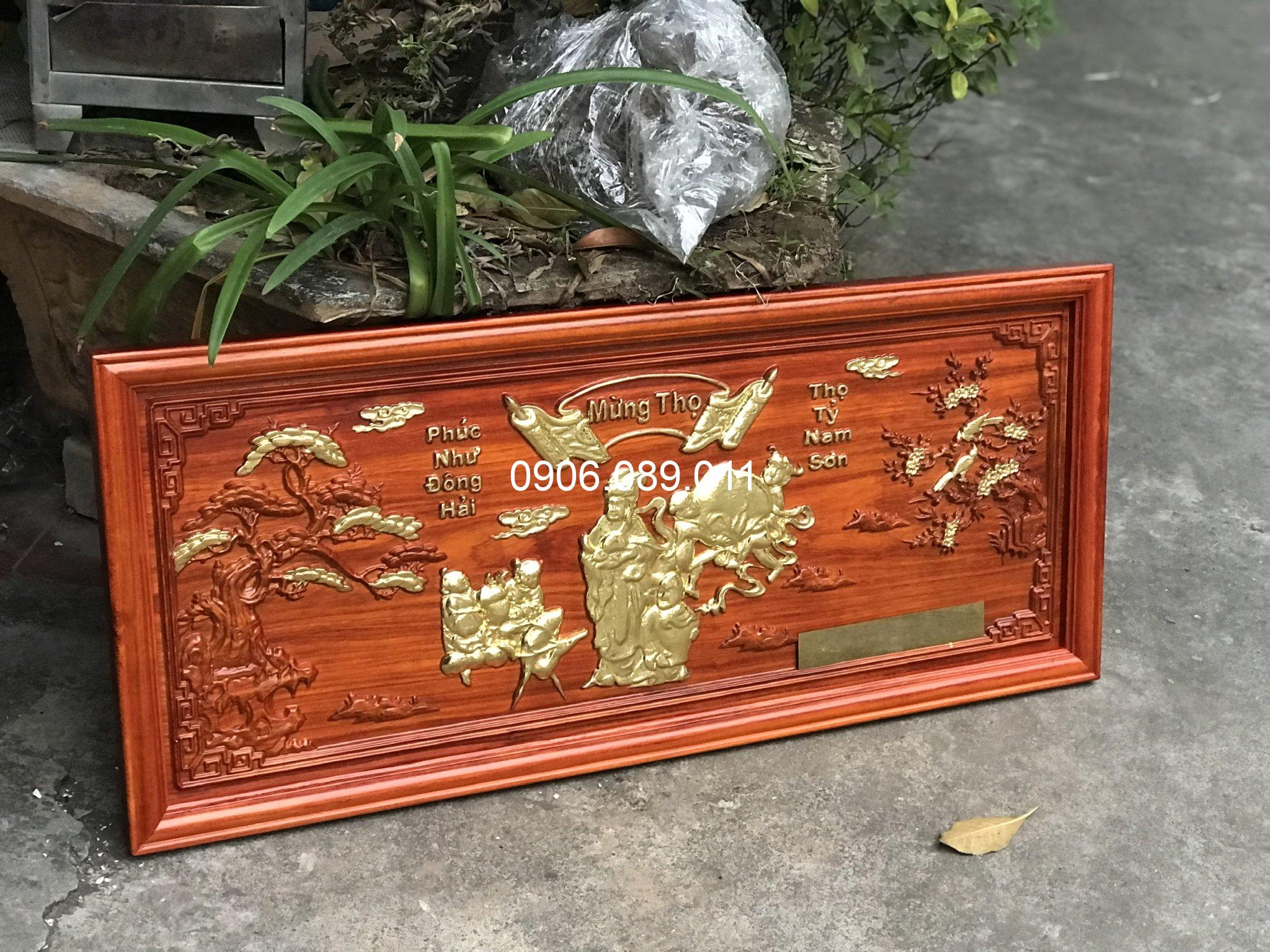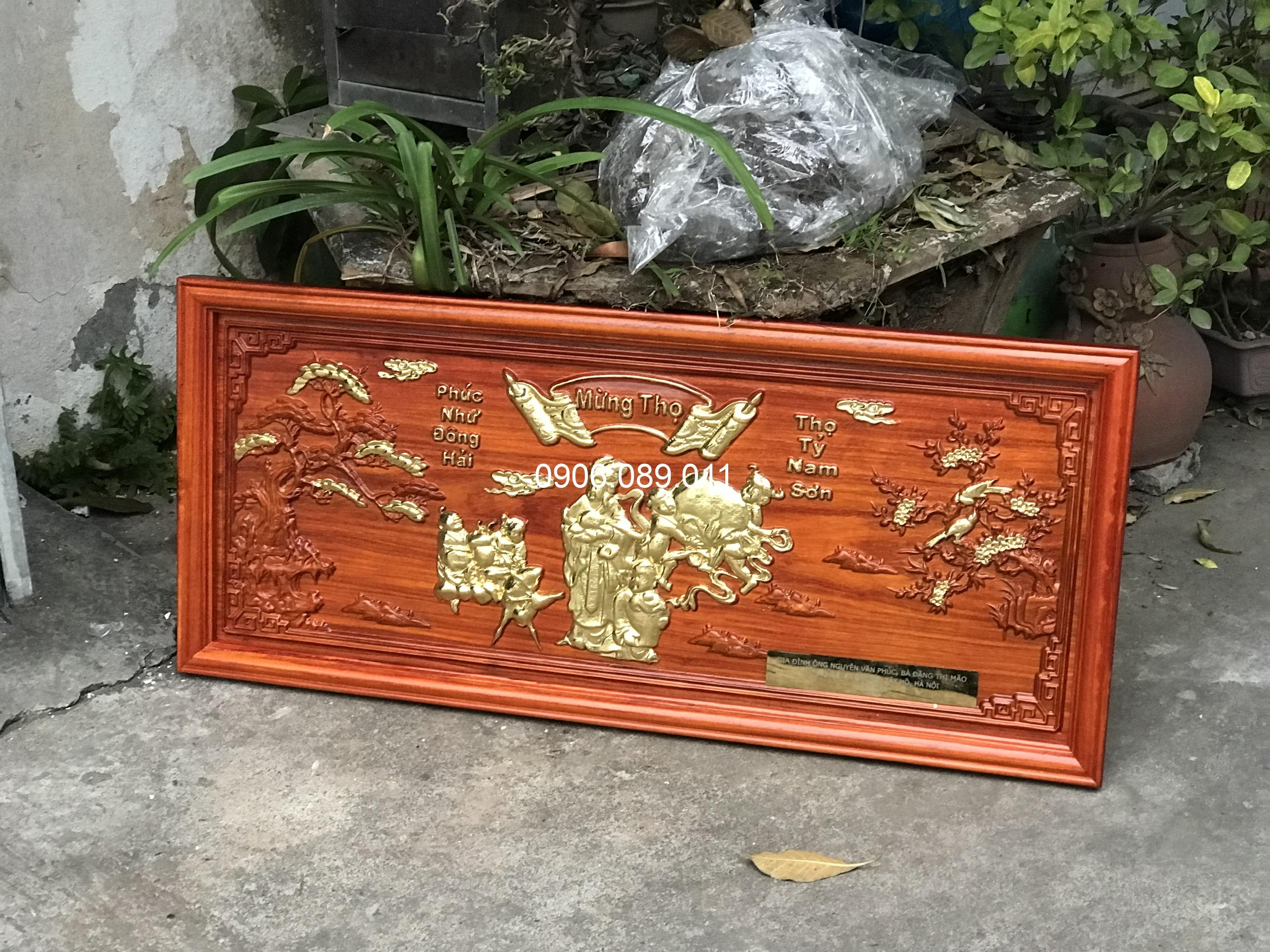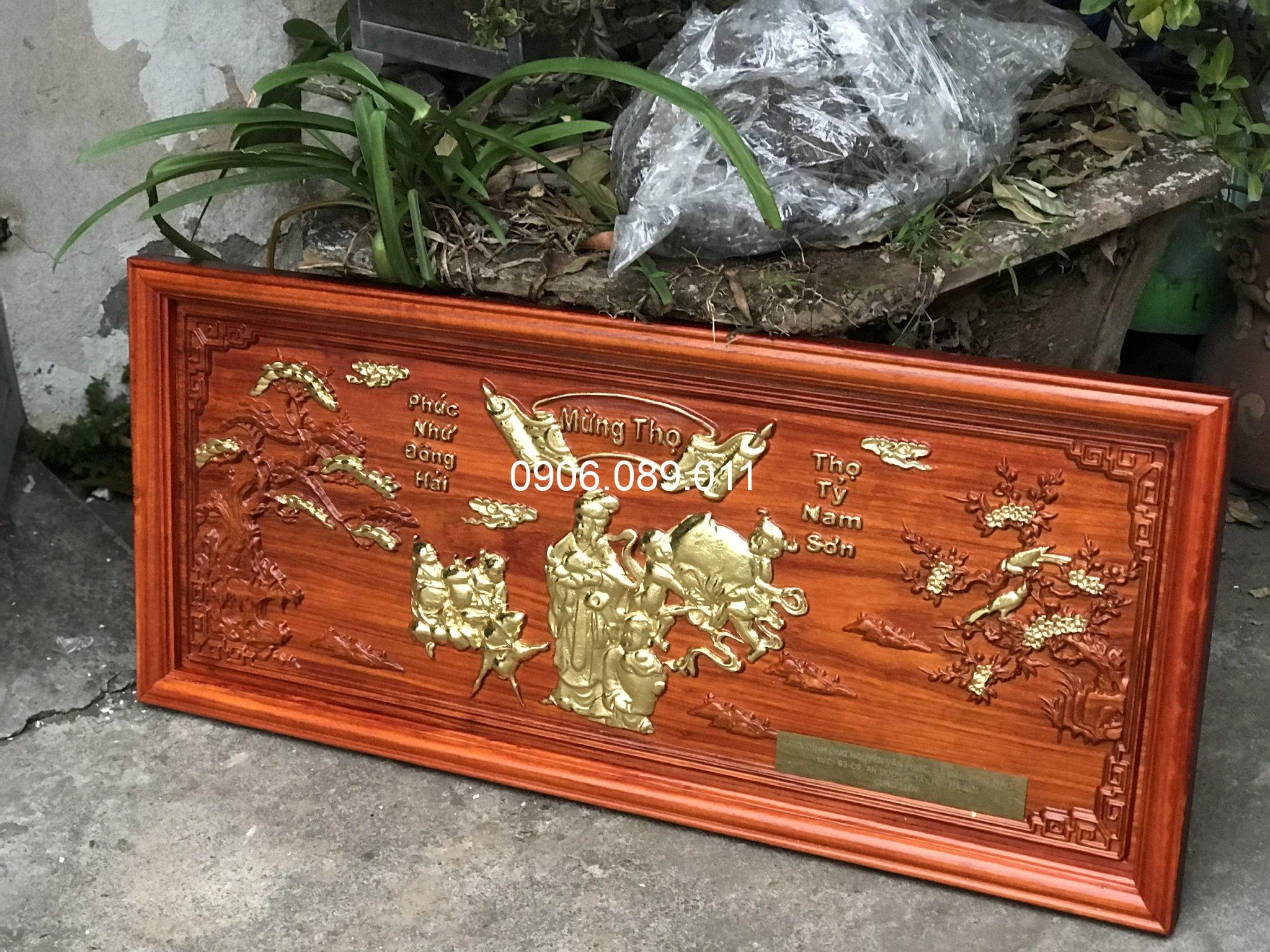 Tranh mừng thọ bà gỗ hương dát vàng 47x107cm