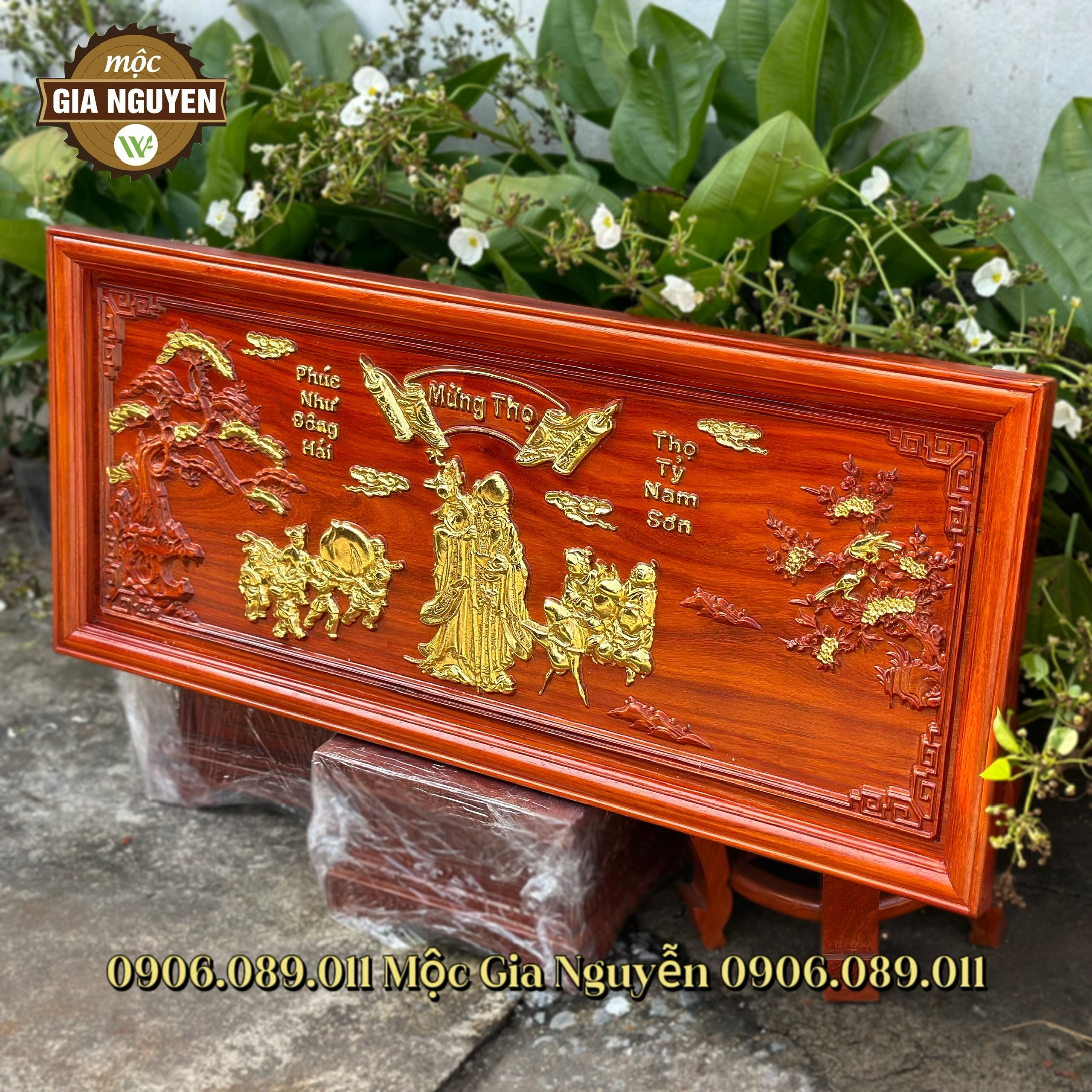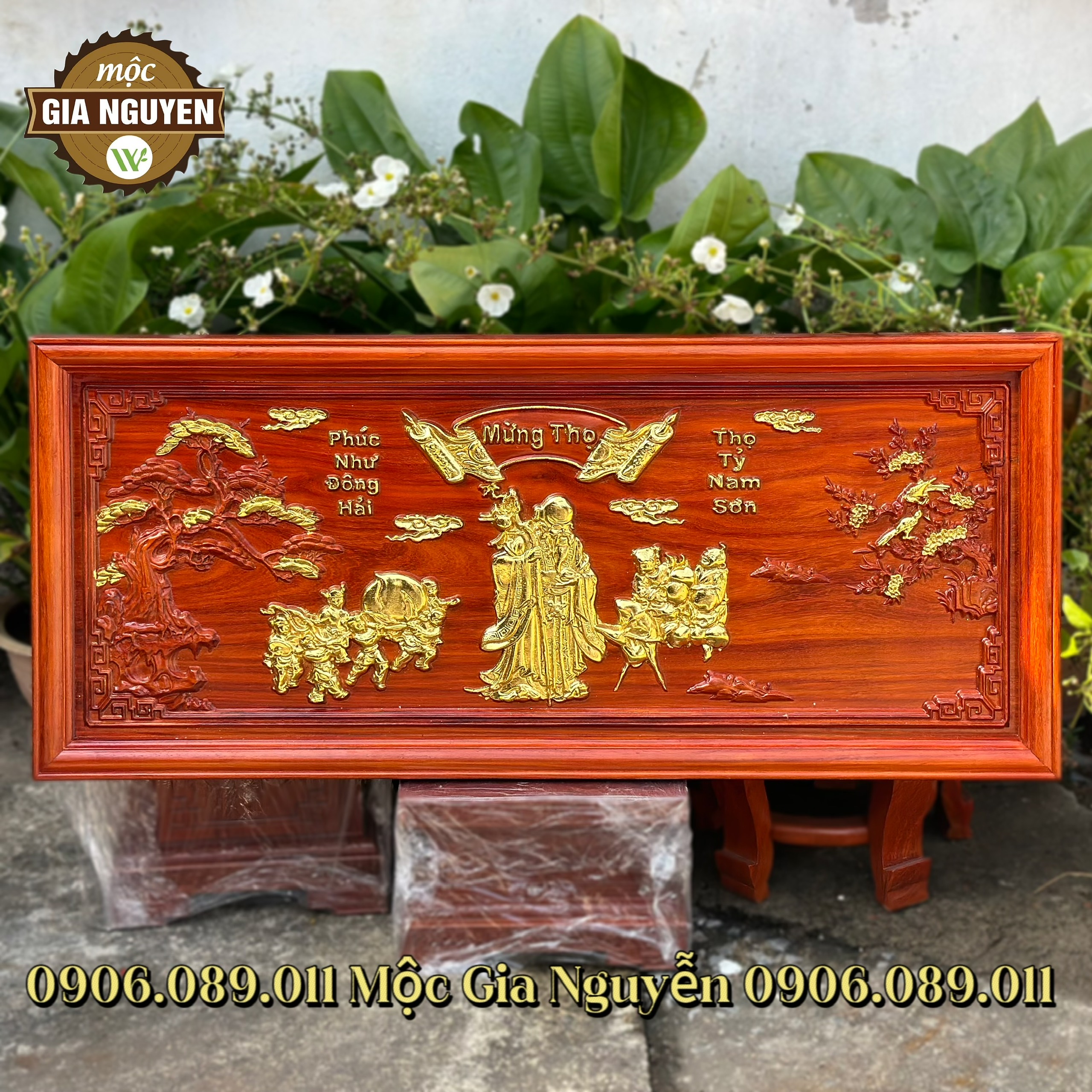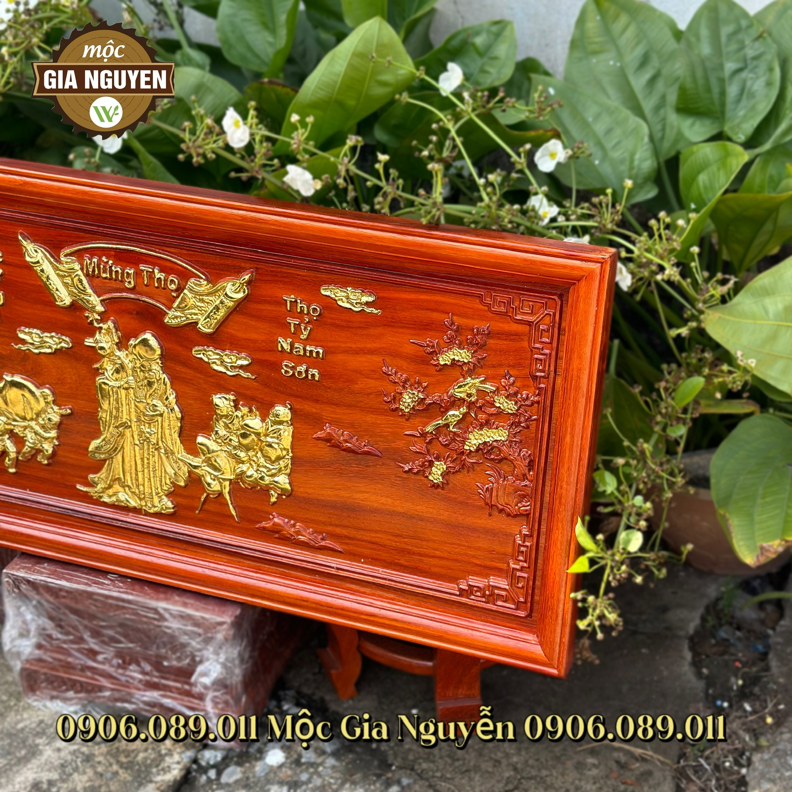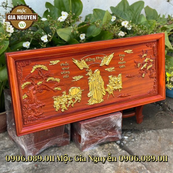 Thông tin sản phẩm: Tranh mừng thọ ông gỗ hương dát vàng 47x107cm