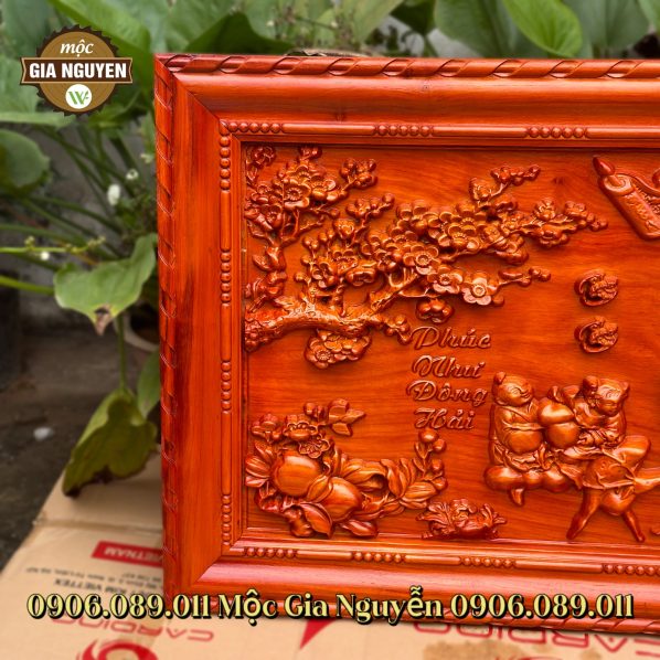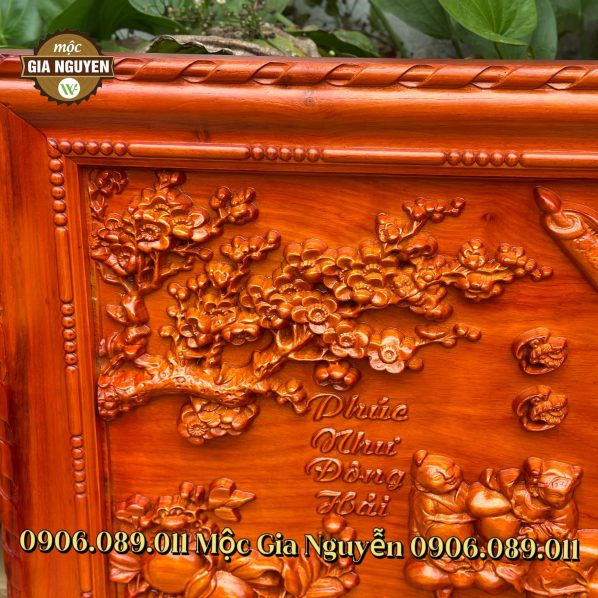 Tranh mừng thọ được thiết kế sang trọng, các đường nét, hình ảnh tinh sảo. Toàn bộ bức tranh được chạm nổi với hình ảnh cụ ông phúc hậu vui vẻ bên đàn cháu. Bên cạnh là cây tùng, cây mai cổ thụ. Và đôi câu thơ đầy ý nghĩa: “Phúc như đông hải, Thọ tỉ nam sơn”.
