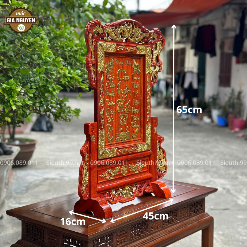 Kích thước hoàn hảo: Cao 65cm, ngang 45cm, sâu 16cm. Phù hợp để đặt trên bàn thờ hoặc làm điểm nhấn trong không gian thờ tự.